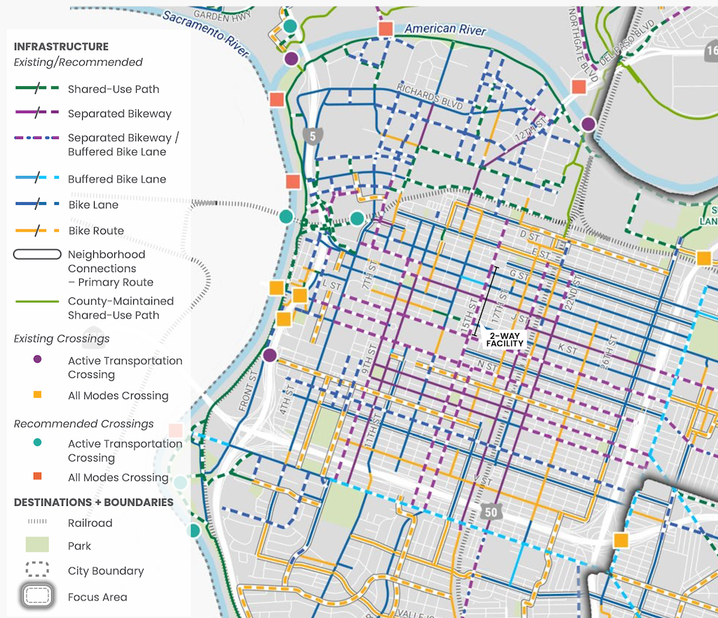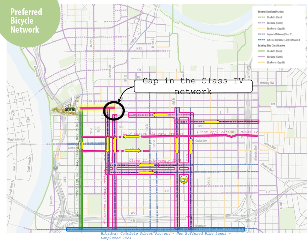 There are other gaps, including 9th Street south of Q Street, and L Street and N Street. The map refers to a L & N Street Bikeways Project, but neither the planning or engineering sections of Public Works seem to have a webpage on that project. Strangely, the streets adjacent to Capitol Park are shown as Class II, paint only bike lanes, though these two sections without mid-block driveways are the most logical place for separated bikeways in the entire city.