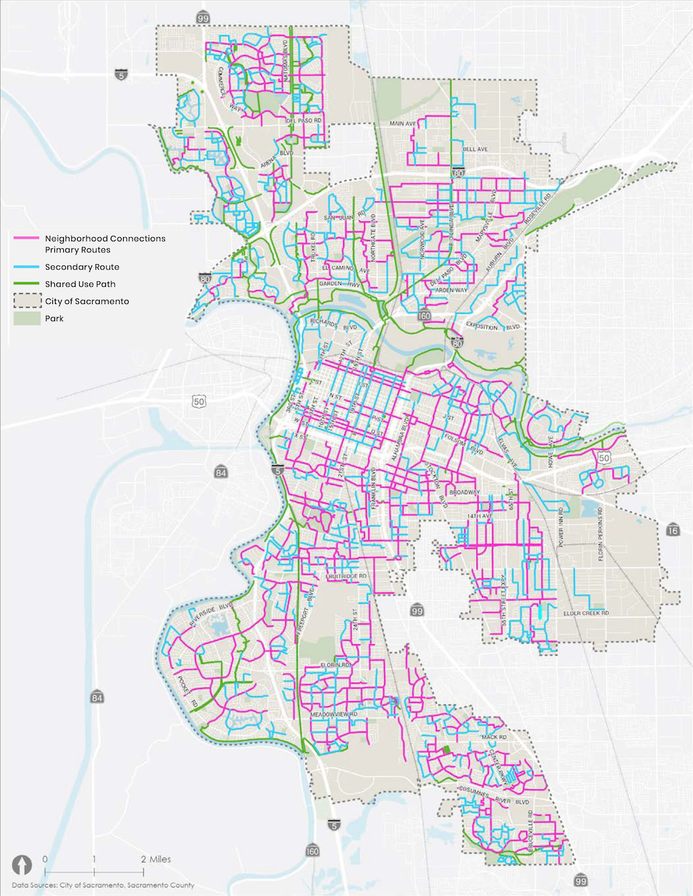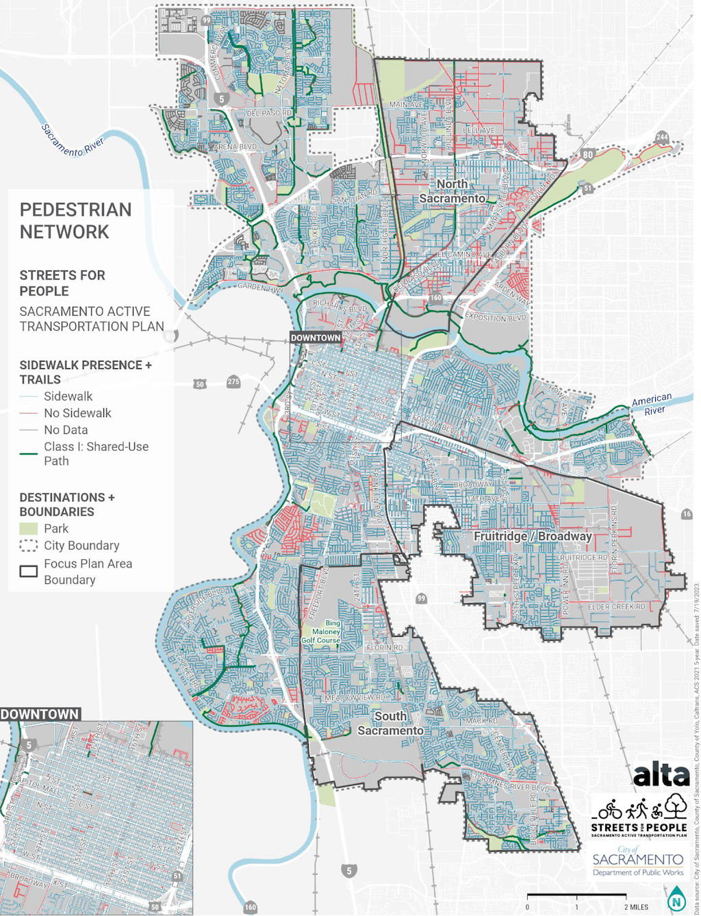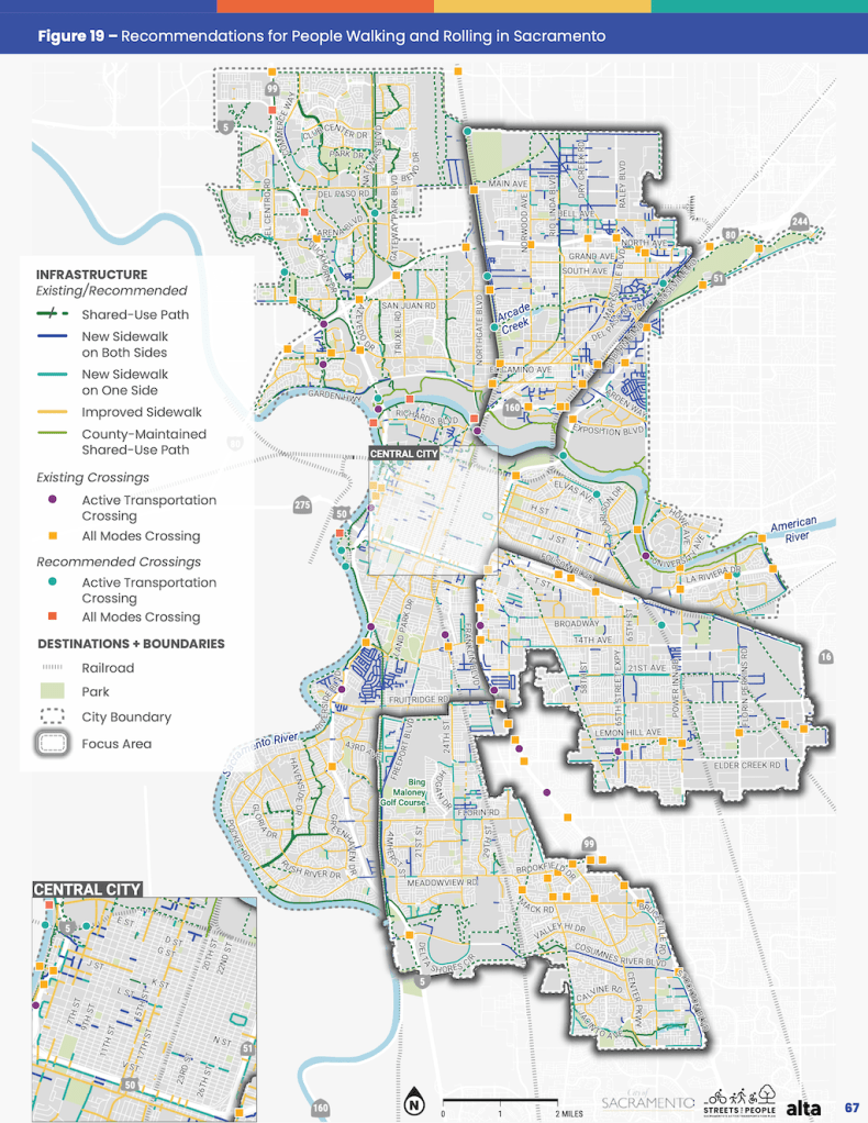 The final Streets For People Active Transportation Plan includes the ‘Recommendations for People Walking and Rolling in Sacramento map on page 67 (pdf), but again, it can’t be zoomed in, and includes recommendations, not existing sidewalk conditions. One could assume that the New Sidewalk on Both Sides indicates that there is no existing sidewalk, and New Sidewalk on One Side indicates that a sidewalk exists on the other side, but not both sides. The plan contains six detailed maps, so it is easy to pick out streets, but again, no information about existing.