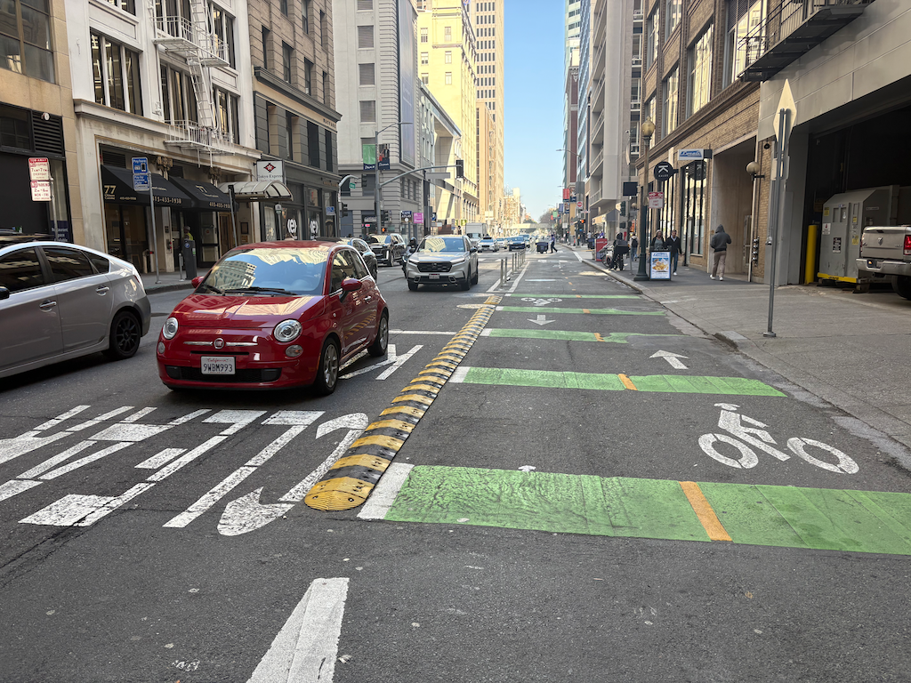 speed bumps across driveway on Battery St two-way bikeway, San Francisco