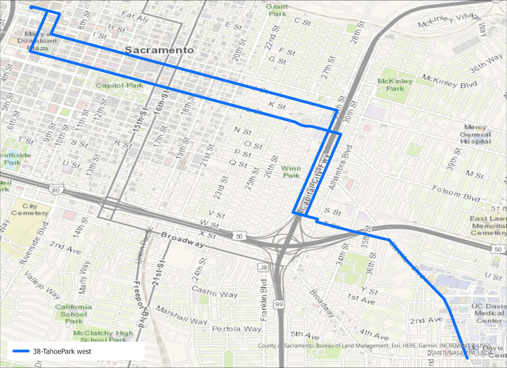 The western part of Route 38, which would become Stockton BRT under the alternative 2 51-38 hybrid, follows Stockton from Broadway north to T Street, then northbound on 30th Street or southbound on 29th Street, then west on L Street or east on J Street, and thence to Sacramento Valley Station.