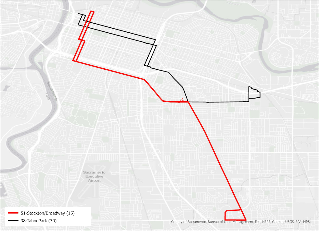 The two existing routes, 51 with a high-frequency (in SacRT terms, though this would be considered moderate frequency in major cities), and 38 with a moderate-frequency, are shown below (pdf).
