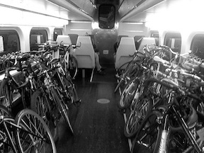 1. One side at both ends of the car should be modified so that it is for bicycle use only. This quadrant should have the seats removed to preclude use by other non-bike passengers, and the window removed so that a set of easy-to-use bicycle racks can be installed. Hanging racks, similar to those used on the Capitol Corridor, or a side rail with bungee cords, similar to those used on Caltrain, could be installed (see Capitol Corridor and Caltrain photos below). With proper placement, these racks would hold at least three bikes in the space that now holds only one. This would provide for a minimum of three bikes per quadrant, or six bikes per car.