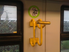 4. People also use the very ends of the cars for bikes, where the stair wells and driver door are, with one to three able to fit in this area. However, on busy trains, these bikes end up slowing boarding and debarking for all passengers. This end area should probably be restricted to one bike, with appropriate signing. So long as the additional capacity is added as above, this would not be a significant restriction.
