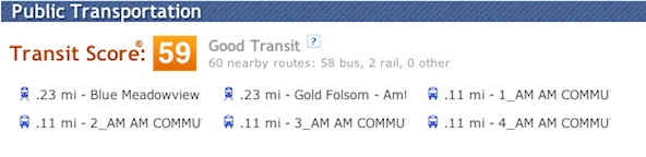 My neighborhood, which Walk Score labels Midtown/Winn Park Capital Avenue, has a Transit Score of 54, “good transit,” far better than most of Sacramento, but below several other neighborhoods. My exact address has a slightly higher score of 59, I think because of my proximity to light rail and several commuter lines. I’m three blocks from a light rail station, two blocks from a stop for several of the regional commuter buses, and within several blocks of several bus routes.