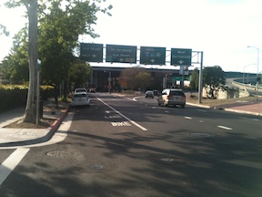 But let’s say that you stick with the law and painted lines, and go right onto 5th and then right onto I Street, which you are forced to do. On I Street, you have one short block to get positioned for your destination. You’ll see the signs on I St westbound at 4th Street, shown at right, but remember that you can’t see the signs until after you’ve already turned, and the traffic on your side of the street, the north side, is already moving at over 45 mph, accelerating onto the freeway or I Street viaduct. If you happen to be a bicyclist, don’t even bother.