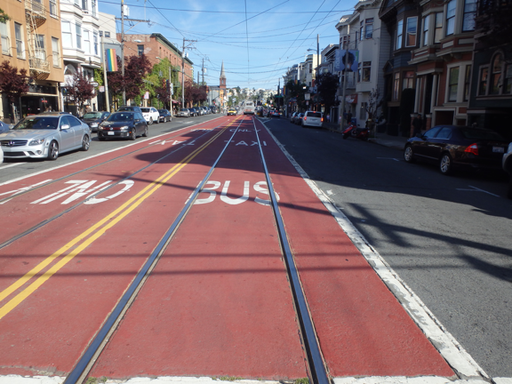 - In addition to the cycle track, this section of 12th St, and south as far as at least H St, or perhaps L St, should have dedicated transit lanes for the southbound light rail tracks. Only the northbound light rail tracks have a dedicated lane or separation at this time. As more travel shifts from privately owned vehicle to public transit, bicycling, and walking, there is a need to devote more roadway capacity to these other modes and less to privately owned motor vehicles. At this time, light rail, express bus 29, and portions of routes 15 and 33 use 12th St. As transit use increases and the area is redeveloped, however, light rail trains will be more frequent and additional bus routes are likely to be added. The potential additional light rail station near the realigned Richards Blvd will also argue for dedicated transit lanes. San Francisco has had great success speeding up their transit system by installing red marked transit-only lanes on major arterials (photo below). In San Francisco, taxis are allow to use many though not all of the red marked transit-only lanes.