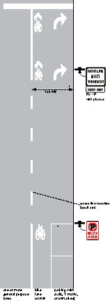The diagram is the standard MUTCD/CA-MUTCD figure showing how a bike lane should be handled with a dedicated right turn lane. Though this diagram is considered by many advocates to be outmoded, it at least shows the bike lane as continuing through the merge zone and does not give precedence to either bicyclists or motor vehicles. It is much better than what Sac County painted.