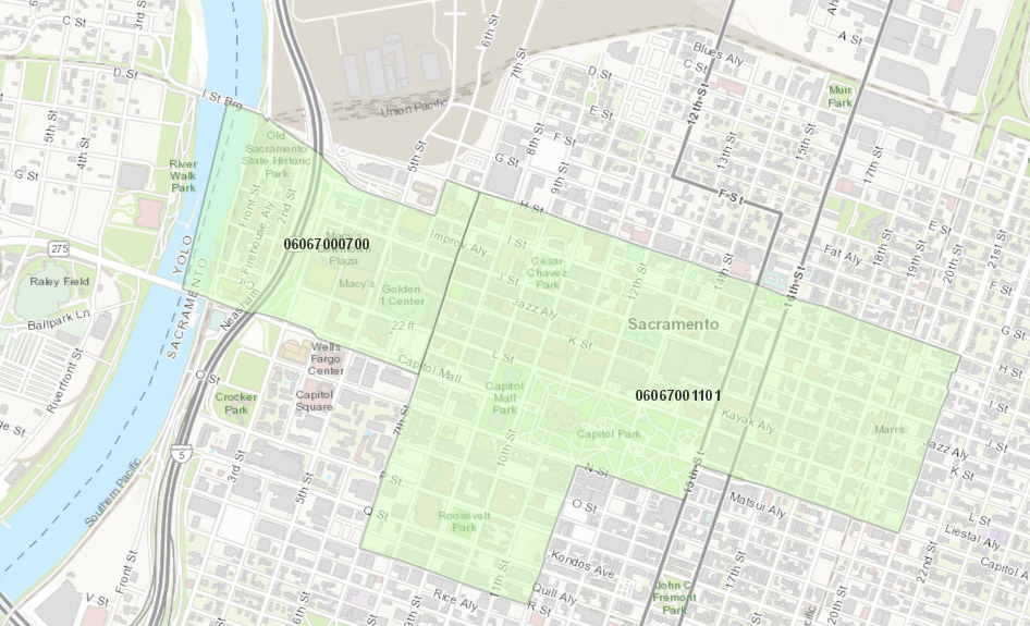 • The population of western downtown, 06067000700, is small, 2798 in 2012, and for 06067001101, 2082, though because it is much smaller 0700 has a population density of 13,990/sqmi while 1101 is only 3,413/sqmi.