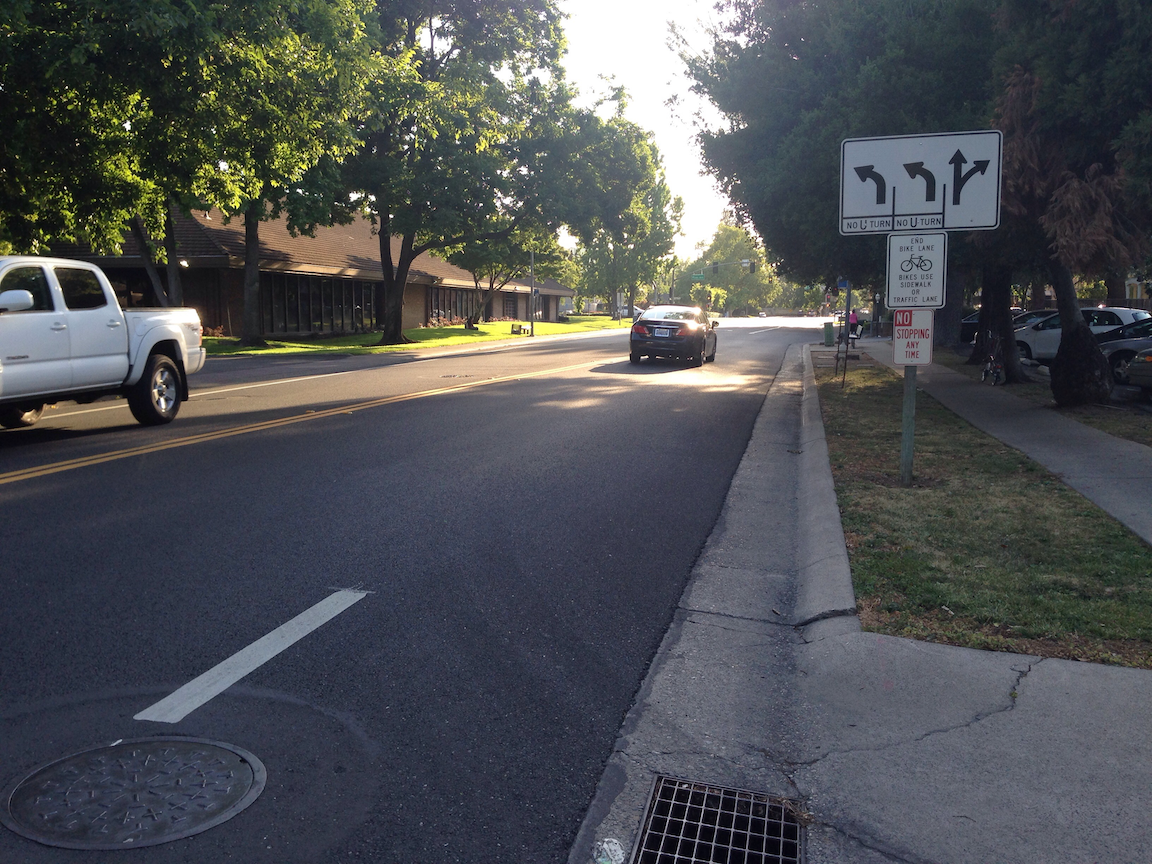 Southbound on Stockton Blvd, there is actually a bike lane between the through lane and the right hand turn lane. This is the type of facility that scares many bicyclists, riding between two potentially fast lanes of traffic. If you assume that the turn lane if inevitable, which it is not, then this is the only way to place a bike lane without significant intersection modification. Southbound on Stockton, there is no bike lane before this short bike lane shows up.