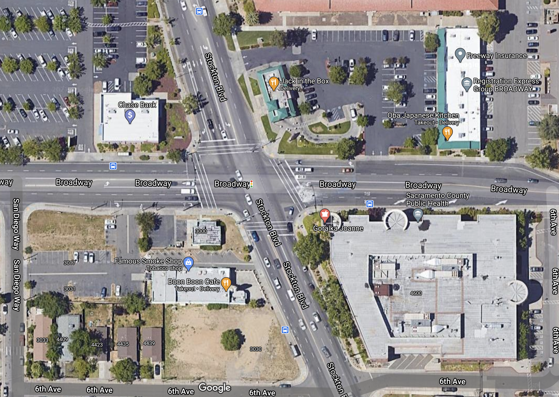 I’ve picked the intersection of Broadway and Stockton Blvd in southeast Sacramento as an example. It is certainly not the worst intersection, but it shows several of the scenarios for bike lanes.