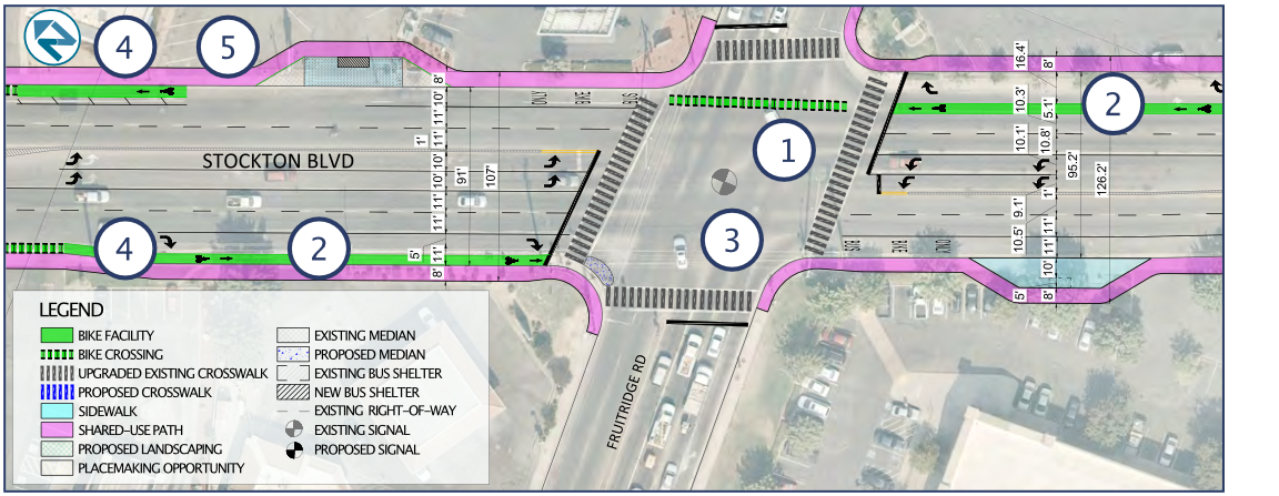 - The flared intersection at Stockton Blvd and Fruitridge Road is preserved in the plan, but this is completely inappropriate. Flared intersections are always more dangerous for people crossing the street. The roadway width at the intersection, shown on page 41, is 90 feet. Crossings of this length cannot be safe, no matter what the length of the pedestrian cycle, without a pedestrian refuge median (with push buttons unless the pedestrian crossing is already on auto-recall). Double left hand turn lanes are dangerous for drivers and everyone else, as driver attention is focused on the vehicle beside, and not the roadway ahead, so these should be reduced to single left turn lanes. The right hand turns lanes should probably be eliminated, unless a traffic study shows conclusively that traffic would not clear during a signal cycle without them. The upshot is that this intersection should be completely reconfigured, not just tinkered with.