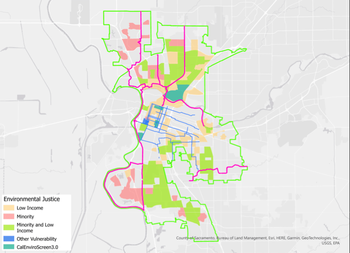 The demographics data for low income high minority communities is from SACOG’s Environmental Justice Areas. This is just one of many possible comparisons. Population density and employment locations would also be interesting. I don’t know what demographic information the city used to come up with the bike superhighways proposal.