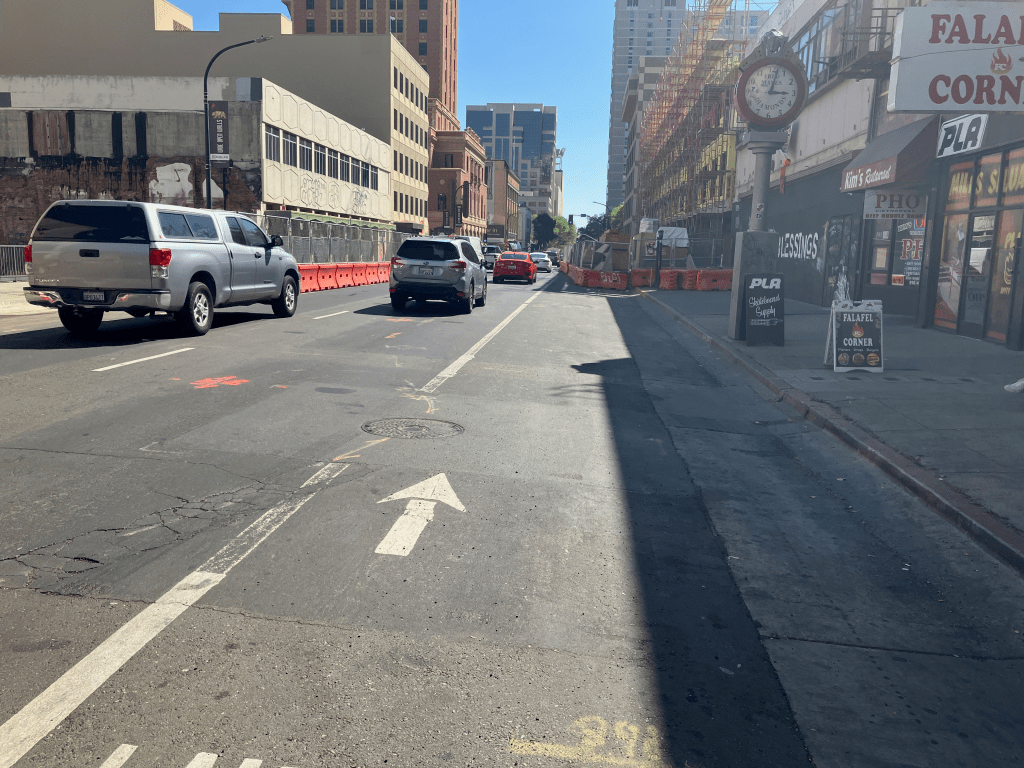 The solution is to either get the construction company to pull the barrier back from the street, returning the bike lane to function, or for a bike lane to replace the right hand travel lane. Since the sidewalk is also blocked, the accommodation can also serve walkers. As you can see from the photo, the left hand general purpose lane is already blocked for a utility work project. That would result in one lane for an unknown period of time, though the utility project seems to be going fairly quickly and might be done within a couple of weeks or less. The city should do a better job of scheduling construction projects so that they aren’t going on both sides of a busy street at the same time!