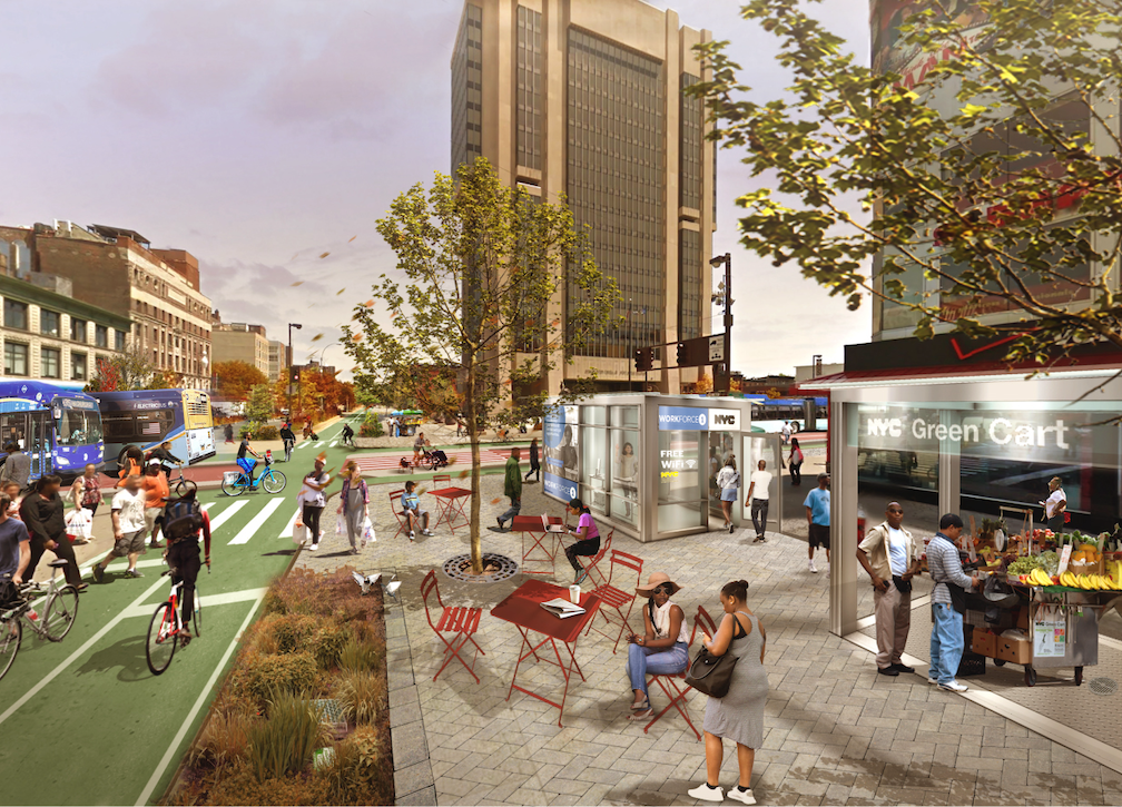 A Google search for ‘photos boulevards without cars’ interestingly produces hundreds of photos of streets with cars, and cars on streets, and mostly, car crashes. But Wikipedia has photos of woonerf, and Google did find one photo of a proposed street redesign for NYC produced by PAU architecture practice.