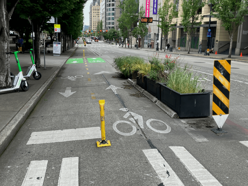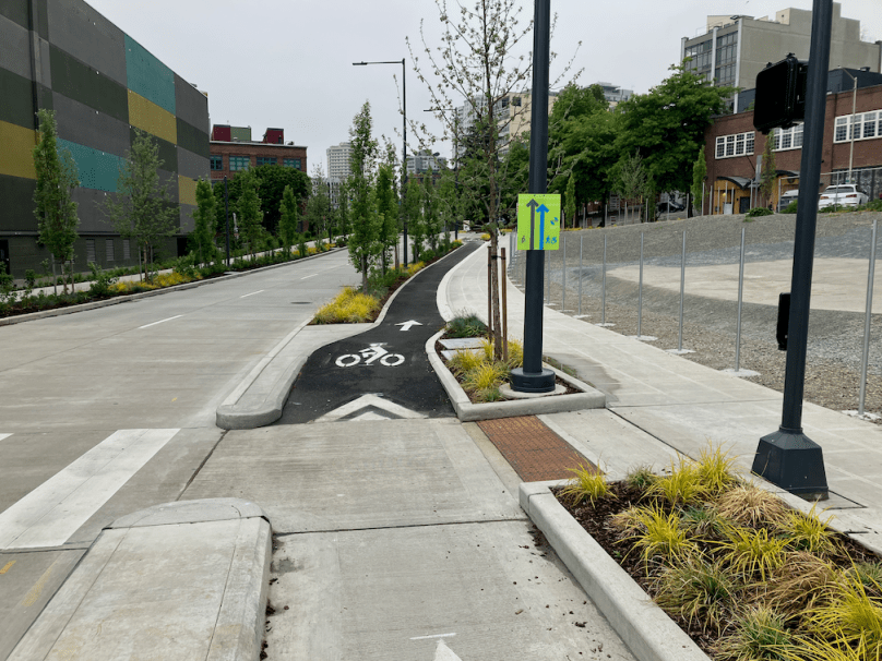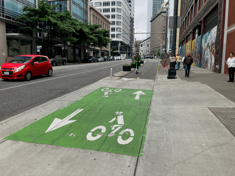 I was in Seattle in May, for Northwest Folklife, and am back again at the moment, reminded that I had not posted about transformations happening in Seattle. Seattle is, on the whole, a very traffic-y city with sparse bike facilities, but what is interesting is what they are doing with re-allocating roadway space to better use than motor vehicles. Bus lanes, wider sidewalks, protected bikeways, removal of parking. It is inspirational.