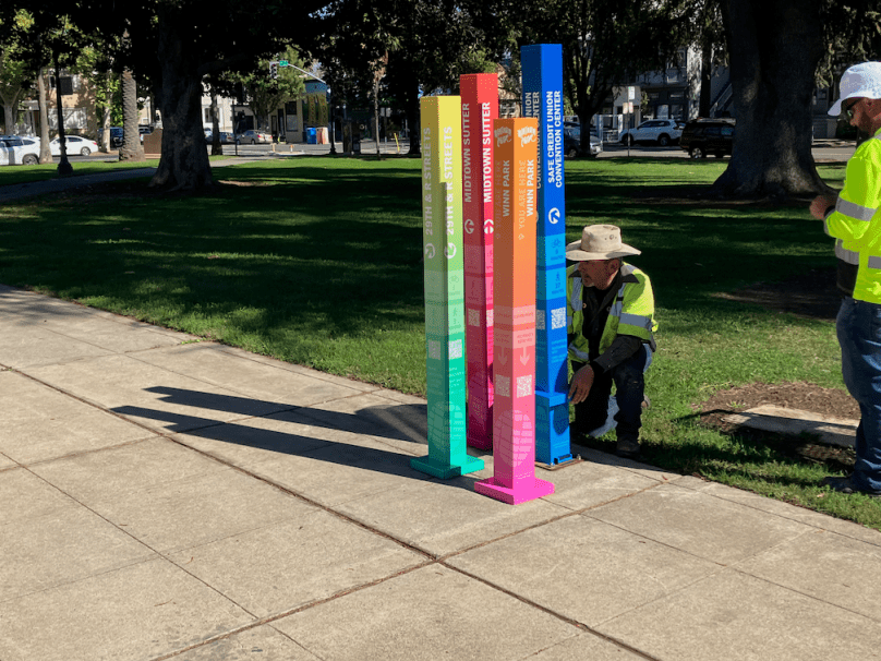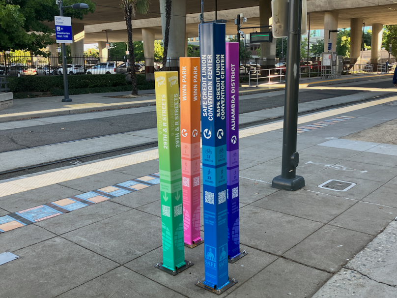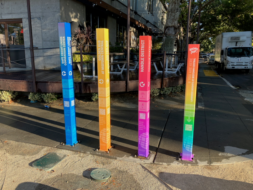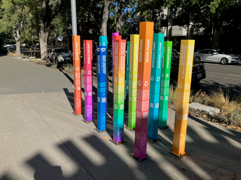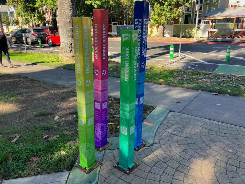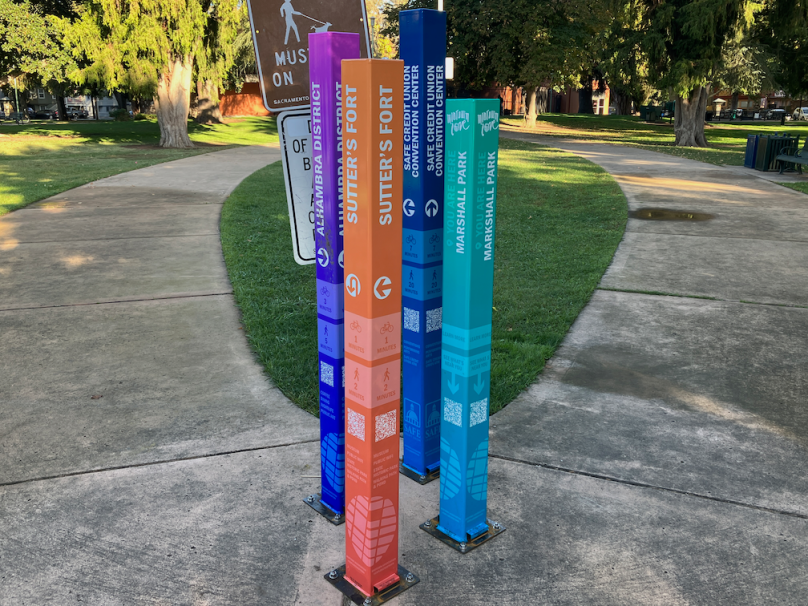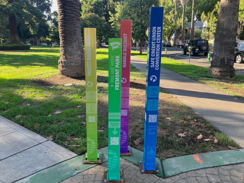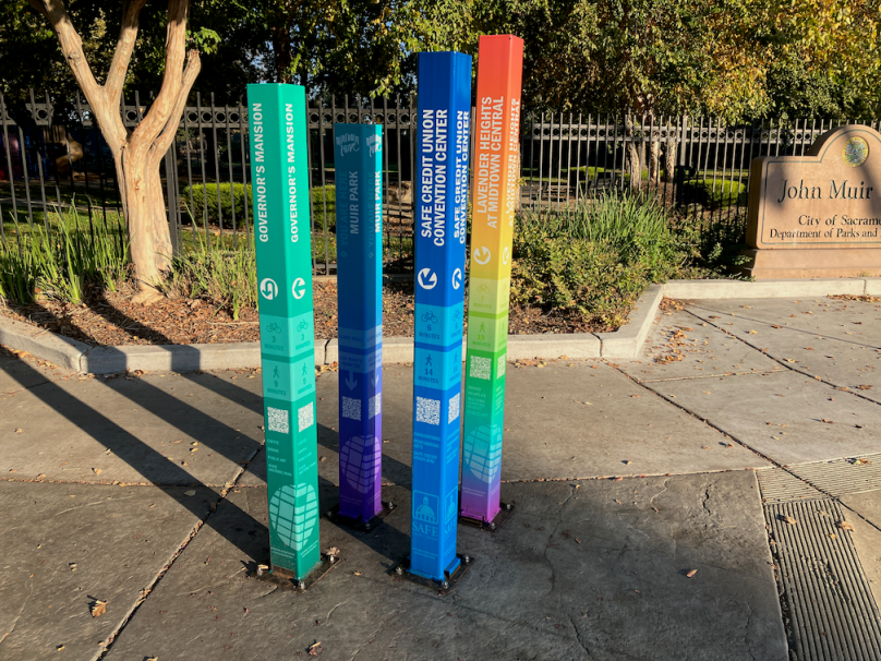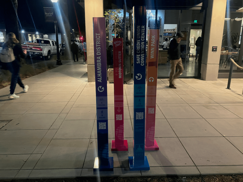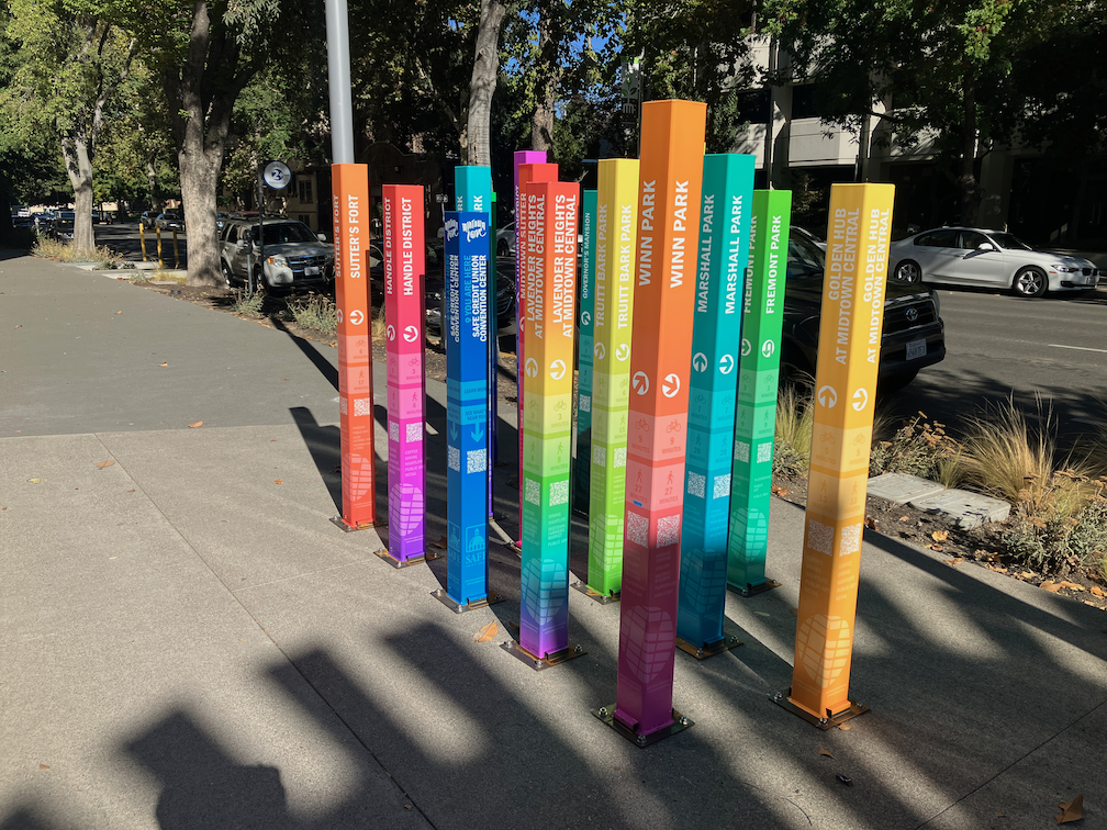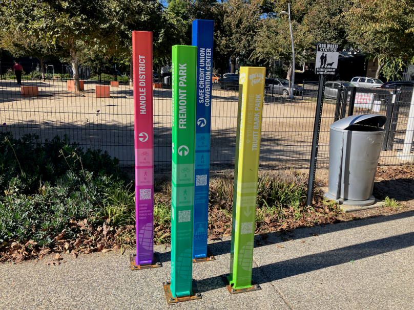 The Midtown Association (Sacramento) has installed a series of wayfinding signs in the midtown area. More information is available at Explore Midtown – Your Way!. It appears that SAFE Credit Union is also a sponsor, as the central origin of the signing is the northwest corner of 15th Street and K Street, on the grounds of the SAFE Credit Union Convention Center and Performing Arts District. This location references 15 other wayfinding locations with its 16 posts. The other locations have four posts, one for the location itself and three destinations. The posts have QR codes which link to an Explore Midtown page for that location, listing nearby attractions and businesses. Businesses not a member of the association are not shown.
