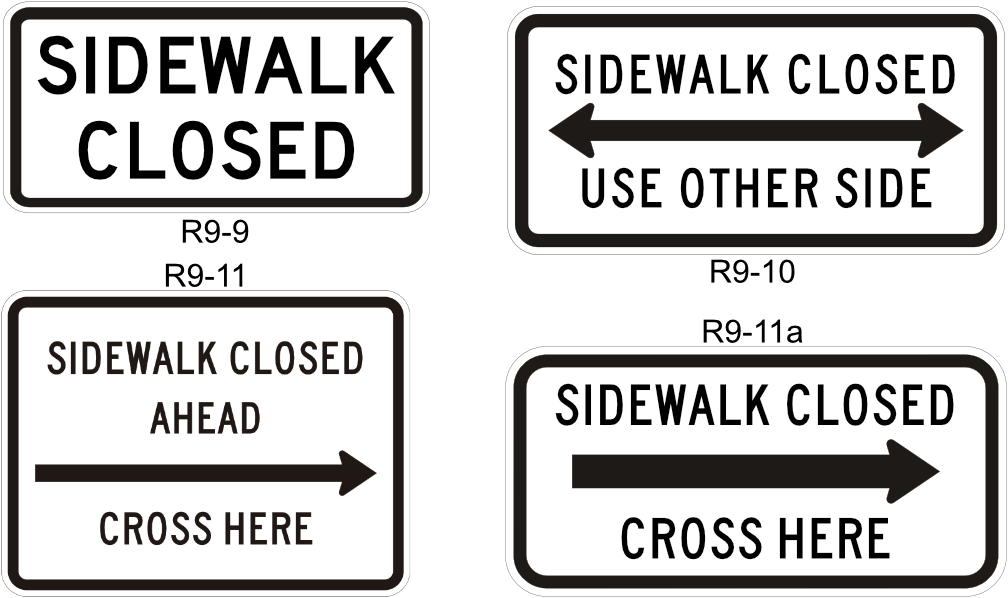 The left diagram is from Applying the Americans with Disabilities Act in Work Zones: A Practitioner’s Guide (https://workzonesafety.org/publication/applying-the-americans-with-disabilities-act-in-work-zones-a-practitioner-guide/), and the center diagram is from Work Zone Pedestrian and Bicycle Guidance (https://www.vdot.virginia.gov/media/vdotvirginiagov/doing-business/technical-guidance-and-support/technical-guidance-documents/traffic-engineering/WZ_Ped_Bike_Guide.pdf).