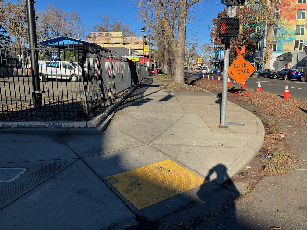 So why is this prohibition here? Why no crosswalk? There is no reason. There is nothing about this intersection, or the traffic on F Street, that would indicate the need for prohibiting pedestrian crossing. Is is for safety? No. It is for the convenience of drivers, one less time they might need to slow for someone crossing the street and lose a second of their driving time. This is the kind of thing that City of Sacramento Public Works loves. But it is unnecessary, and it is ILLEGAL. All intersections have legal crosswalks on all legs, whether they are painted or not, and if a leg does not have a crosswalk, the law (PROWAG) and best practice (MUTCD) require a detectable barrier so that a blind person knows that crossing is prohibited.
