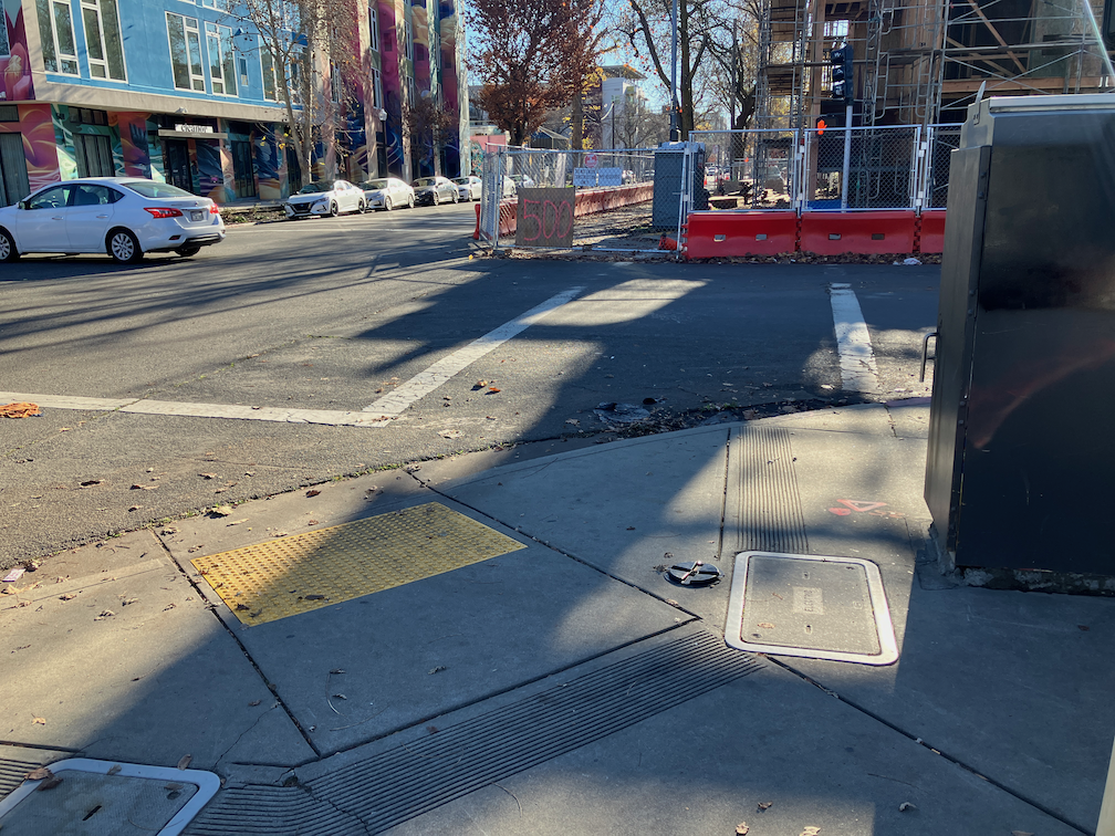 But why does a good project have to have a negative impact on people walking? The answer, of course, is that the city allows it. And in this case, the city’s street design in this area makes the situation worse, and impossible to provide safe and convenient ADA access. The details are below, a lot of detail, but I think it is important to document just how wrong things can be.