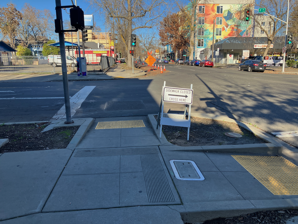 1. […] The construction project at 16th Street & E Street, southwest corner, 500 16th Street, apparently called Studio 30, an affordable apartment complex, still has not corrected its significant flaws in ADA signing and barriers. An earlier post covered the difficulty in properly signing and routing due to the city’s mistake in prohibiting crossing on the north side of the 16th Street and F Street intersection: SacCity bad work zone and bad street design converge. […]