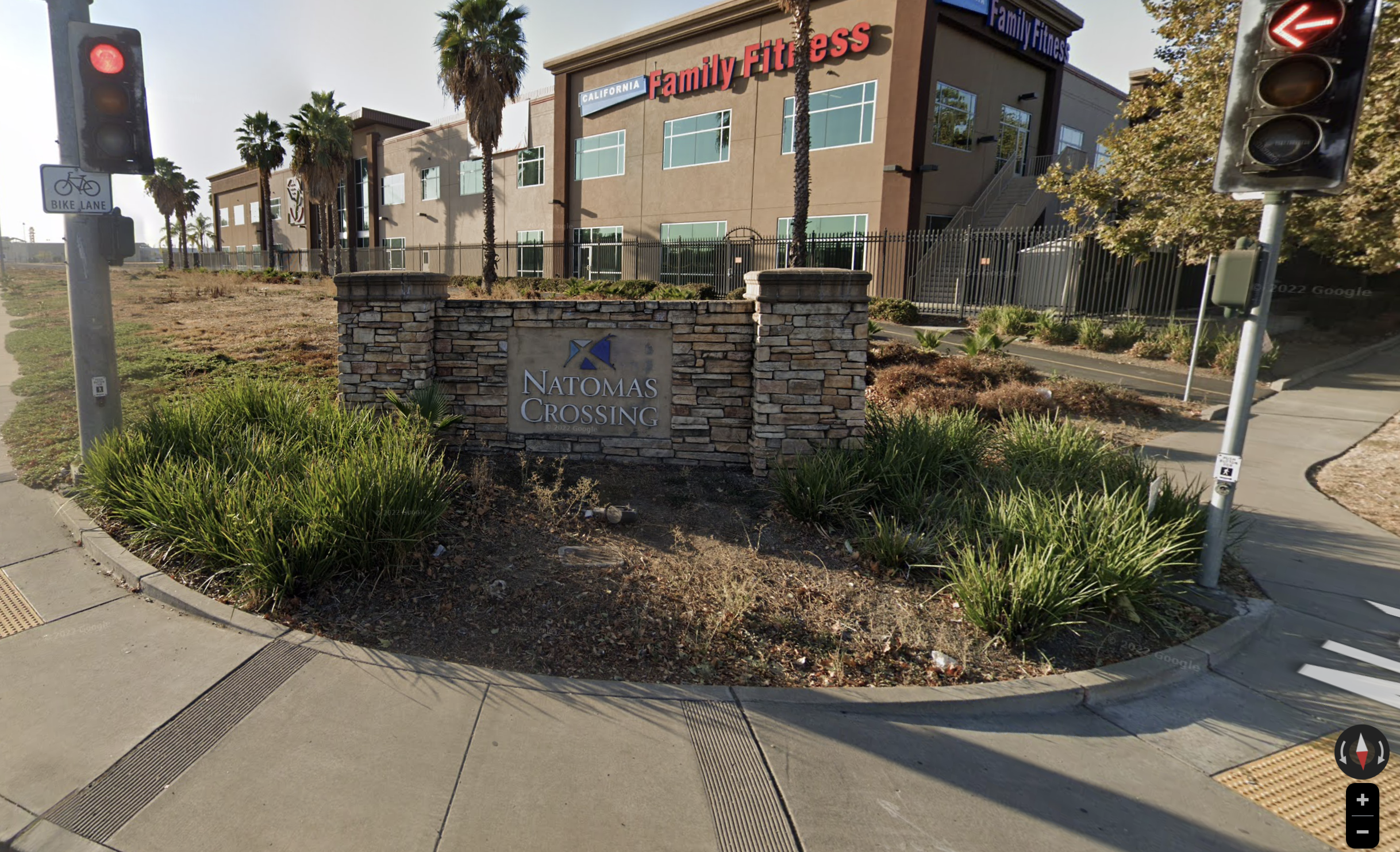 Note the Natomas Crossing sign (next photo) that occupies the corner. I do not know property ownership here, but I suspect the sign is on public property. The sign prevents the trail from aligning with the crosswalk.