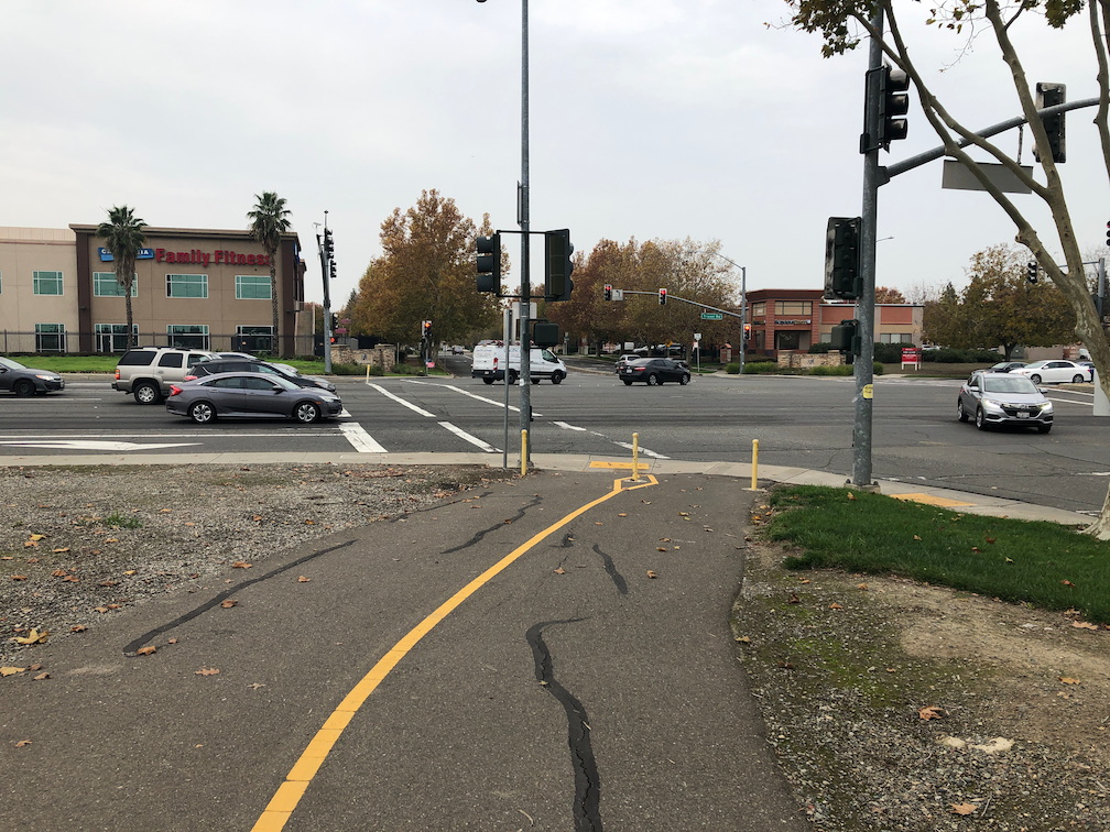 Realign Jackrabbit Trail ends at Truxel Road: The Jackrabbit Trail on the west side of the intersection (northbound) should be realigned to be perpendicular to Truxel Road, so that there is an easy and direction connection to the crossing. It may be that the trail could pass south of the Natomas Crossing sign, but it may be that the sign will need to be moved. The east side of the intersection (southbound) should also be realigned to be perpendicular. It may be that the trail could pass south of the traffic signal pole, or it may be that the pole will need to be moved.
