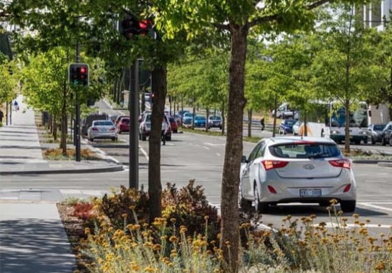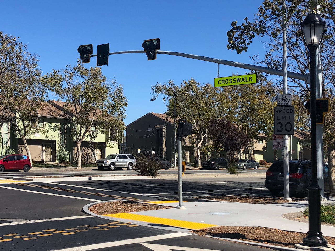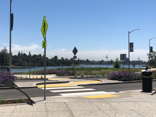 Curb extensions extend the curb into the street and improve visibility at intersections, and slow vehicular turning speeds.