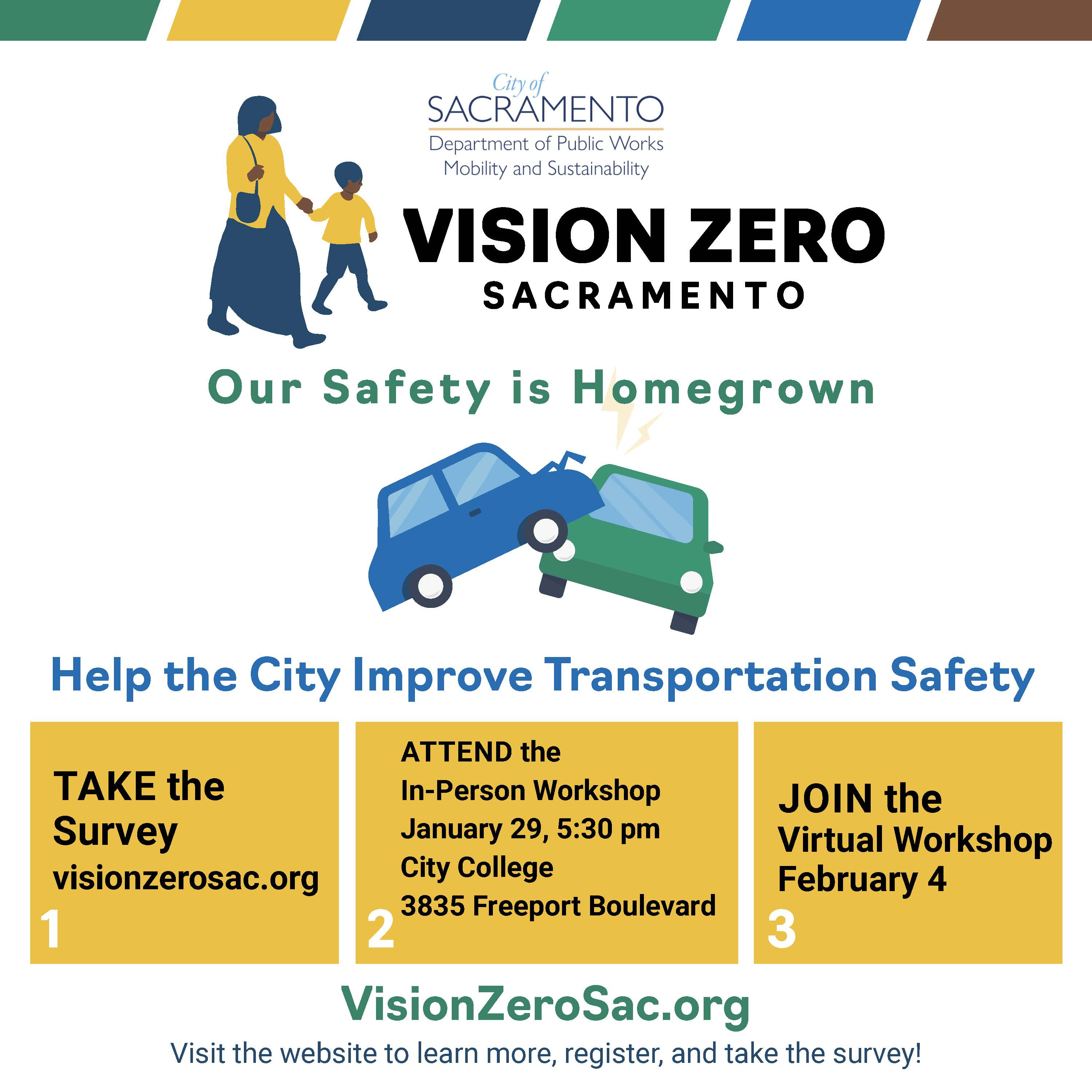 In person: Vision Zero Action Plan Community Workshop Thursday, January 29 at 5:30 pm, Sacramento City College, 3835 Freeport Boulevard registration
