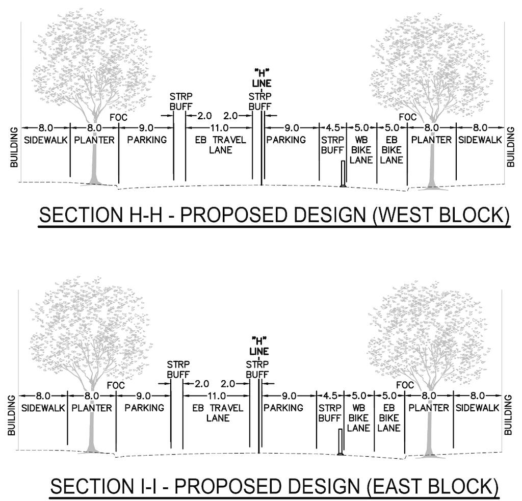 The segment design for 8th Street to 9th Street is reasonable. However, since there are no driveways in this block, the separation between motor vehicles and bikeway should be a hard concrete curb, not a stripped buffer. The 10 foot bikeway is the desired minimum width. Section diagram below.
