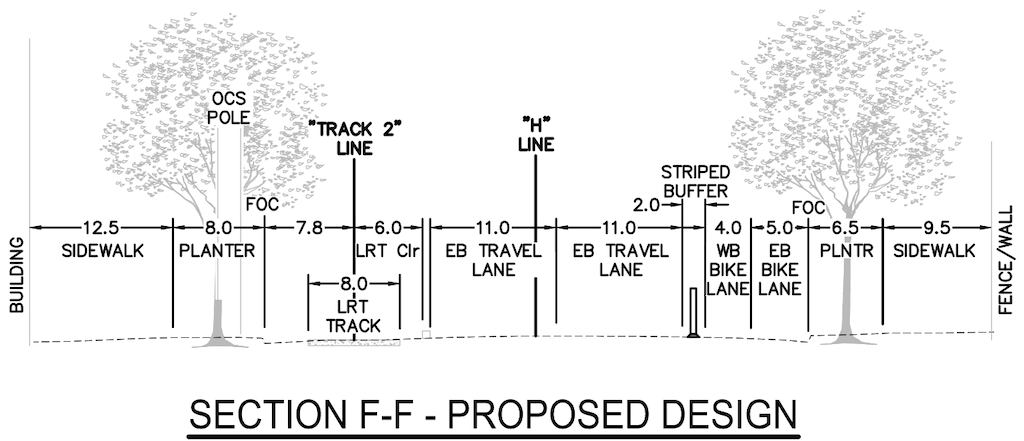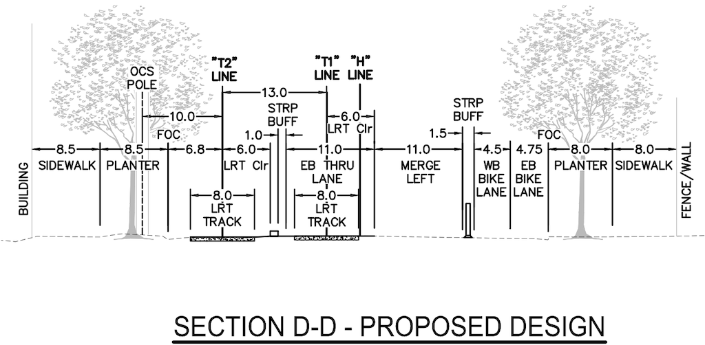 The segment between 6th Street and 7th Street shows a light rail track sharing with motor vehicle traffic. This is inappropriate, and removes the advantage of double-tracking, since trains can be stuck in congested motor vehicle traffic. The southern or right hand lane should be a combined through and right turn lane, and the northern or left hand lane should be eliminated. The design constrains the bikeway to 4.5/4.75 feet, rather than the desired minimum of 10 feet. Diagrams below.