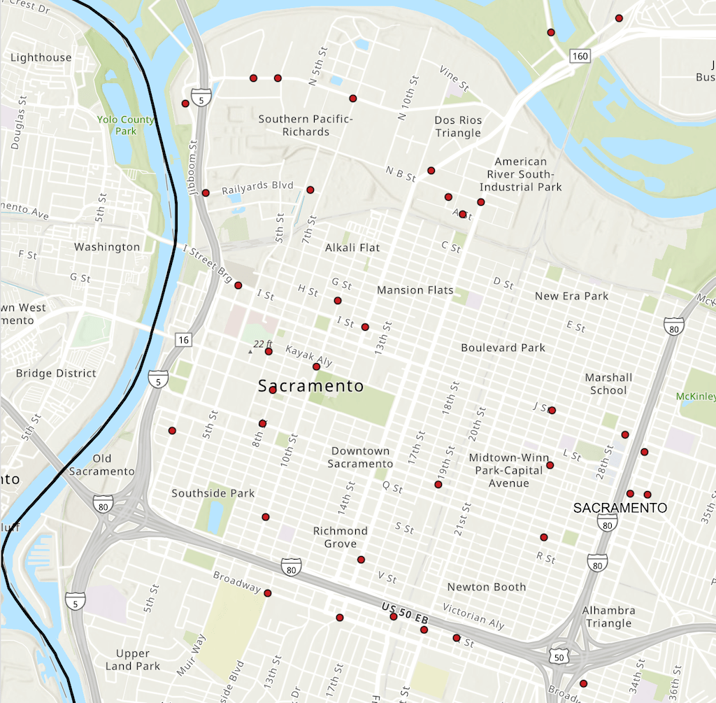 The map below, an except from the Vision Zero Crash Dashboard Interactive Map, shows only fatalities in the central city (American River to Broadway, Sacramento River to Alhambra). Of the 34 fatal crash locations shown, it appears that five are not at intersections, therefore 29 are at intersections.