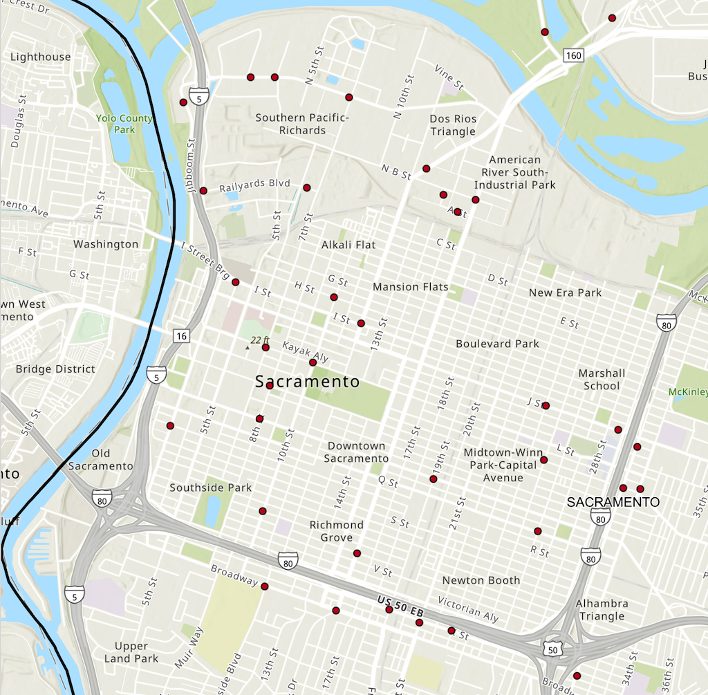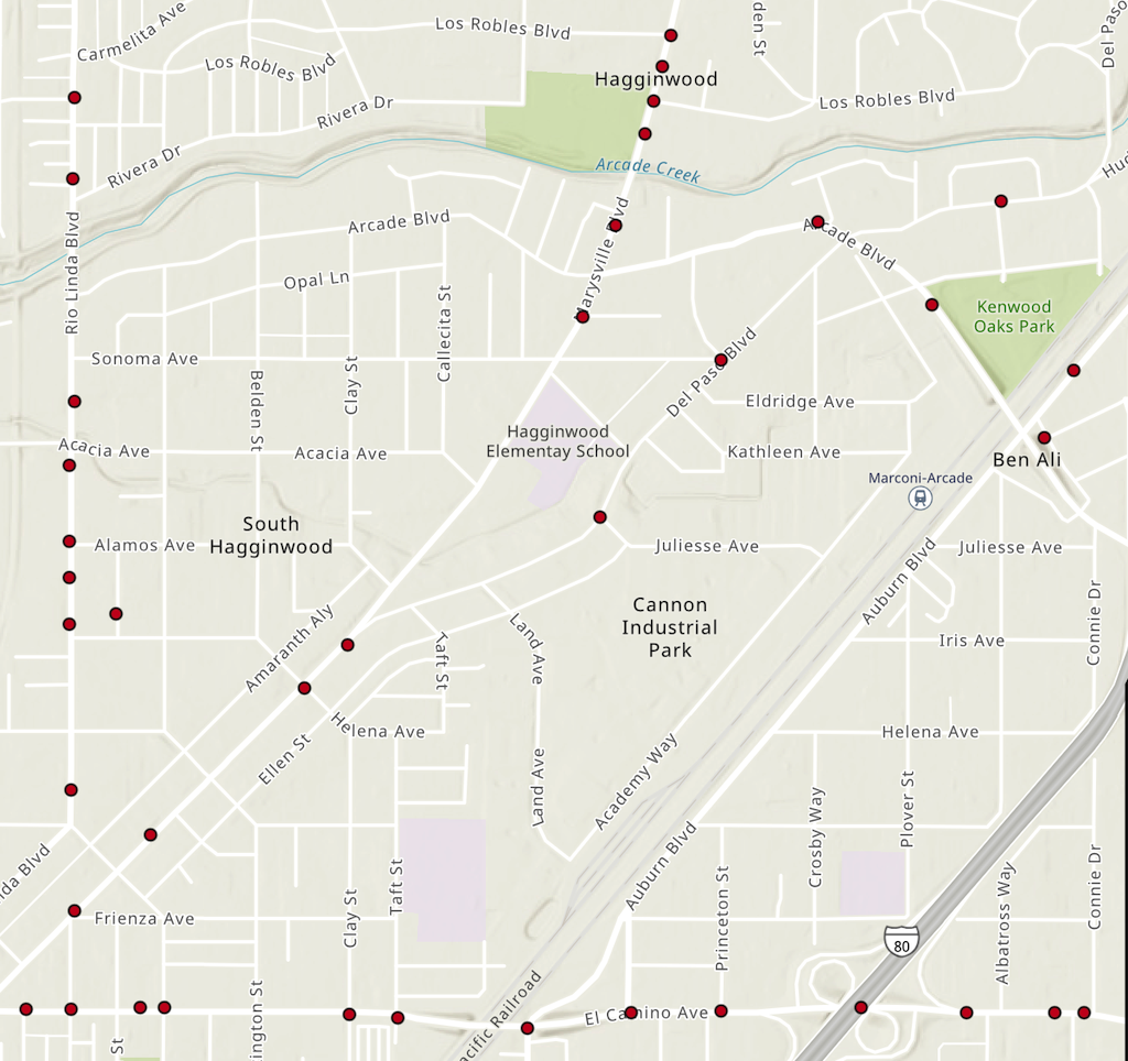 A corridor pattern is more evident on this map. Both El Camino Ave (at the bottom) and Marysville Blvd (middle north) have been identified as high injury corridors.