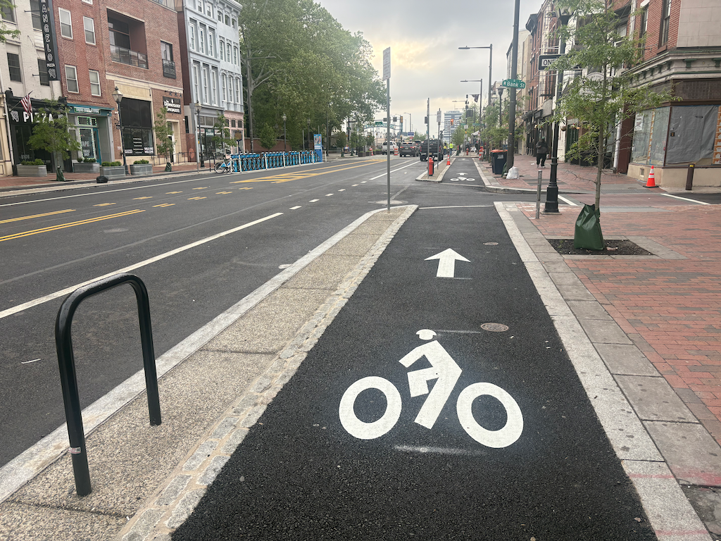 Philadelphia downtown has a significant bicyclist mode share, but it mostly seems to be on the north-south arterials and collectors, not on east-west streets. But this may be an artifact of the time of day I observed. It has a wide variety of bike facilities: traditional bike lanes, vertical delineator ‘separated’ bikeways, two-way separated bikeways (cycle tracks), parking protected bikeways, bikeways along transit islands. I don’t know the criteria, but I suspect that available roadway width is a determinant.