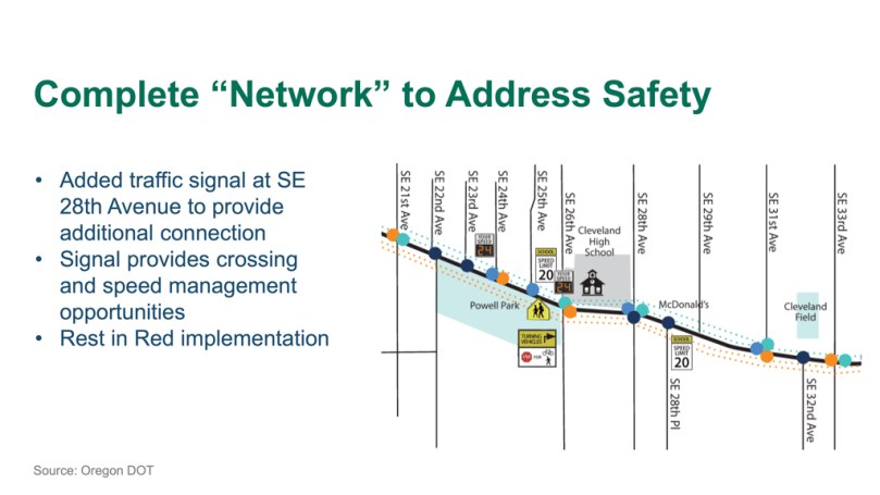 Alternative 1 removes the bike lanes, probably in recognition that traditional bike lanes on a high speed arterial are not safe. The posted speed limits are 40 to 60 mph, with actual speeds of course higher. Both alternatives say ‘lower speed limits’ but don’t provide the target.