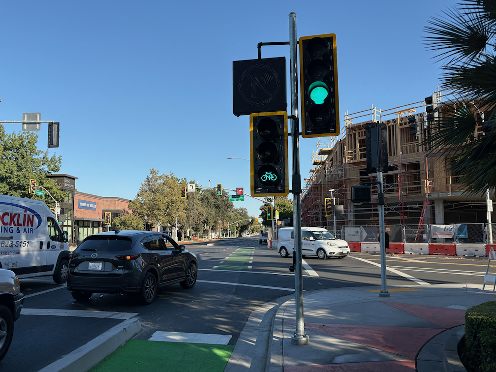 - The bike signal must have an exclusive phase where all other vehicle movements are prohibited. A properly designed intersection with a properly designed signal system probably would not need an exclusive phase, but this is NOT a properly designed intersection and NOT a properly designed signal system.