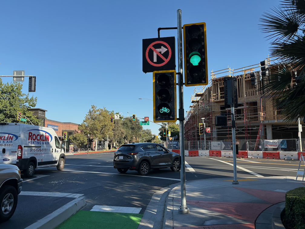 When the bike signal is on, there is a period of time when the no-right-turn sign is not on (blanked out), as below.