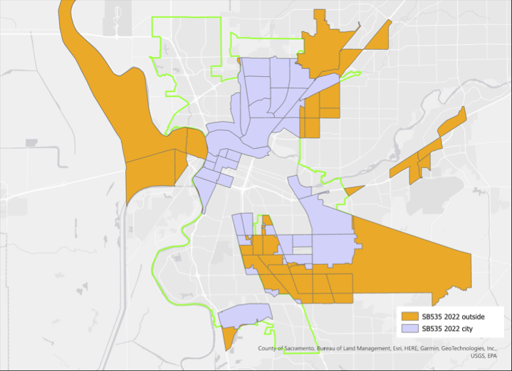 The City of Sacramento General Plan 2040 update draft offers a map of the SB 535 disadvantaged communities (DAC), on page 7-6, reproduced below. The areas are census tracts, and their number is labeled. Census tracts do not necessarily follow city boundaries, some overlap with county areas.