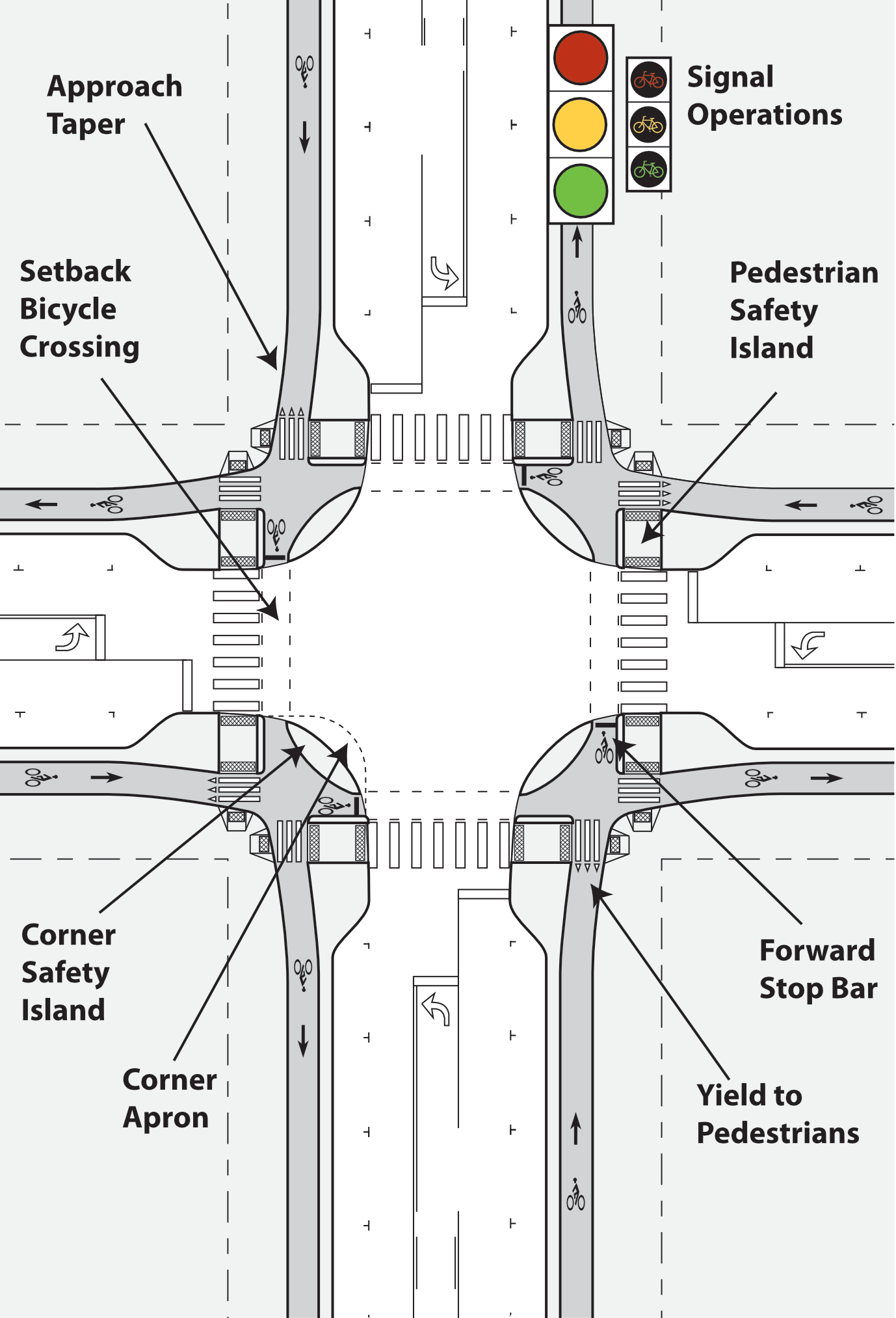 - New and reconstructed intersections will include curb extensions, raised crosswalks or raised intersections, and/or protected intersection design