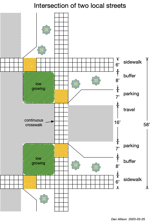 When two local streets intersect, the priority should be for people walking. I’ve created a diagram of what such an intersection might look like, and measure. Notice that the travelway, the area used by moving motor vehicles, is much narrower than is true on most existing streets. This is intentional. Drivers are slowed by their perception that there is a limited space to pass other motor vehicles, or bicyclists for that matter, and limited shy distance from parked cars. Not only does this make the street safer, it also makes it more pleasant for everyone. Drivers traveling any distance will leave these streets in favor of wider/faster streets. Bicyclists can mix with other traffic due to the slow speeds, and do not need a dedicated area. Design and posted speed (if posting is even needed) would be a maximum of 20 mph, and might be less.