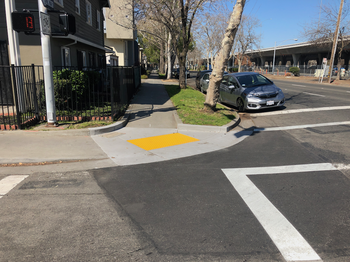 Getting a little closer, you can see that there is a bus stop for which access has been blocked by the construction signing. The bus stop is no longer accessible to anyone with mobility issues. I just talked to a SacRT employee, who said they had received no communication from either the city or the construction company about this blockage. SacRT will consider temporarily moving the bus stop. The construction company could have placed fencing and signing to maintain access to the stop, with a detectable barrier beyond the stop, but they did not. I suspect the city didn’t even notice this in their Traffic Control Plan. The city generally accepts whatever the construction company writes, without field checking it. It is well known that the city and most construction companies consider walkers and transit users as unimportant.