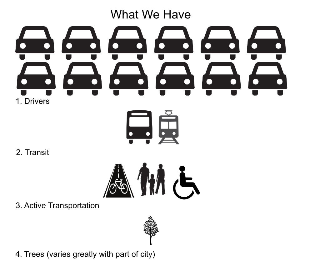 This is in complete contrast to the transportation system we have built. Below is the transportation system we have. One could argue endlessly about how this varies with parts of the city, and whether active transportation should be lumped together, but the graphic communicates the problem.