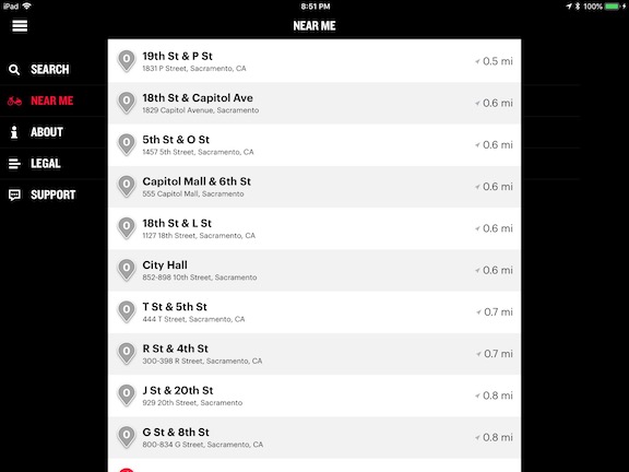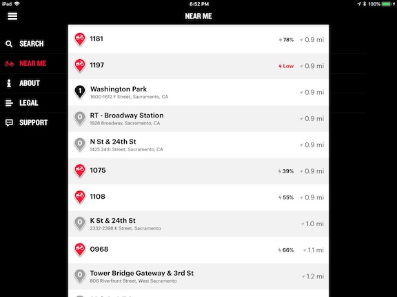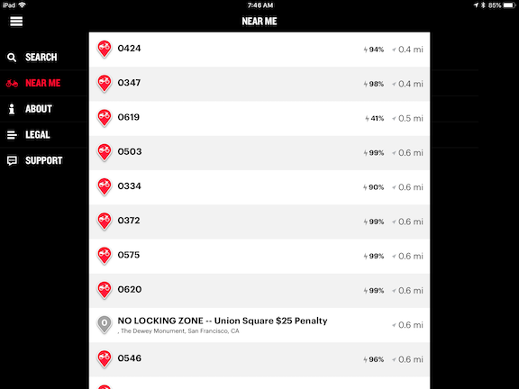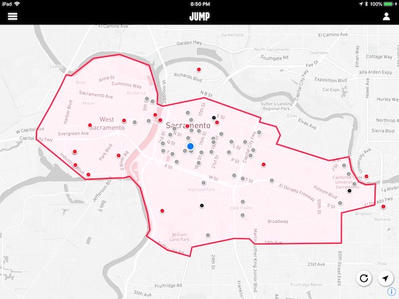 New in the JUMP app within the last few days (thanks Matt for noticing) are drop zones, marked with a green lightning bolt icon. I thought these might be charging hubs, promised for ‘some day’, but they are drop zones, just regular JUMP system racks (exclusive JUMP racks and other racks that were part of the SoBi system). I checked three of the 12 racks on the Sacramento side, and none are charging racks. This makes me question the assumption I made that the green hubs in San Francisco are charging hubs; they may also be just drop zones. I’ll be in SF tomorrow and will report.