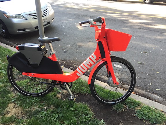 The purpose of the drop zone hubs is to accumulate bikes that need charging so that it is easier for JUMP staff to locate them and return them to the West Sacramento warehouse for charging. The city hall hub had five ‘in repair’ (very low battery) bikes parked there this afternoon, so the idea is working to at least some degree.