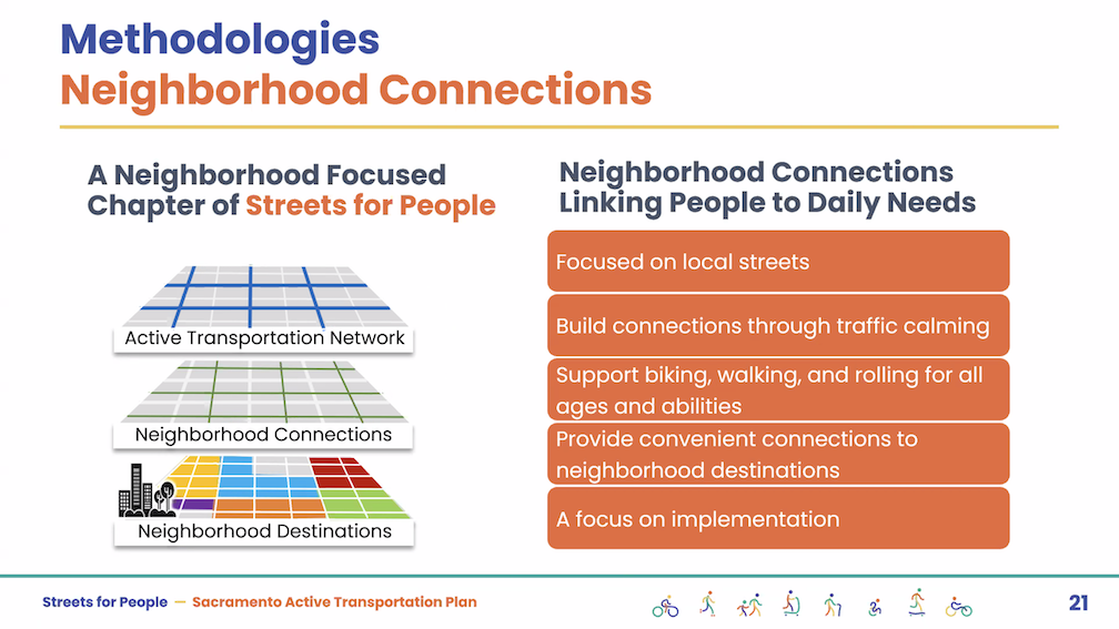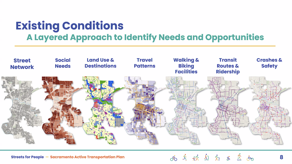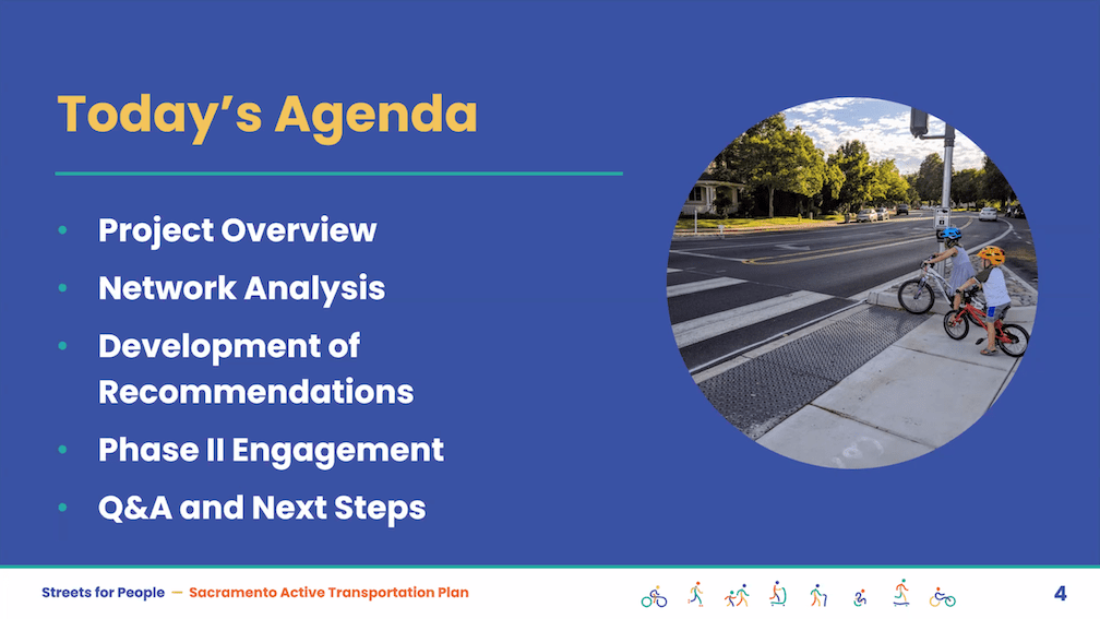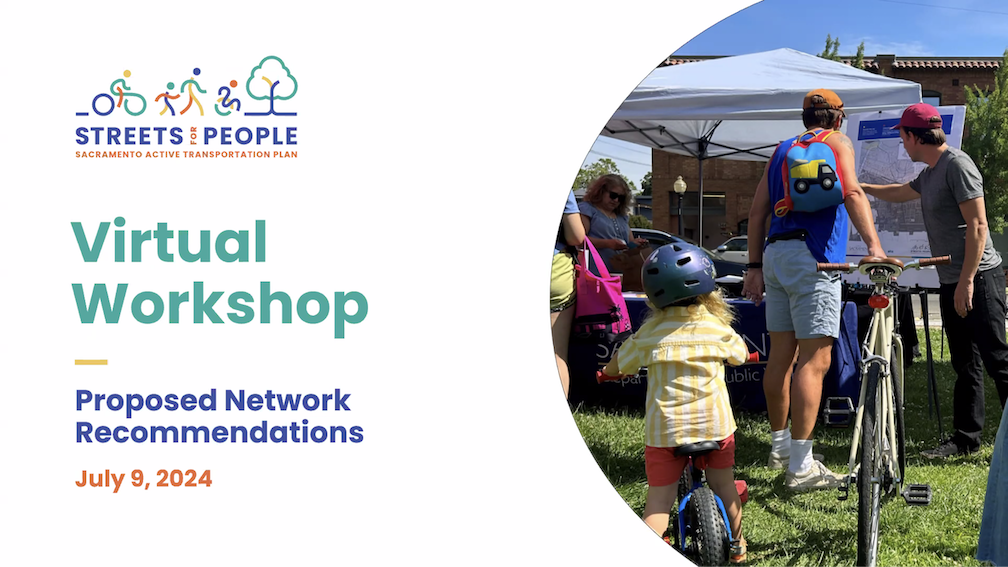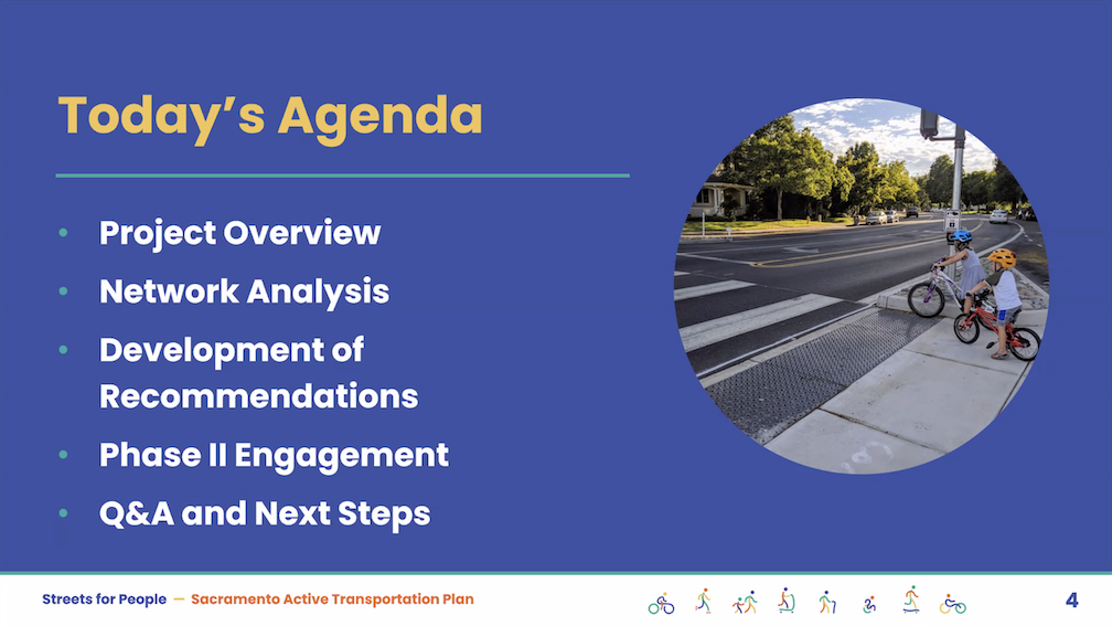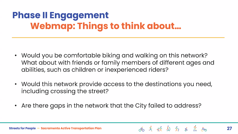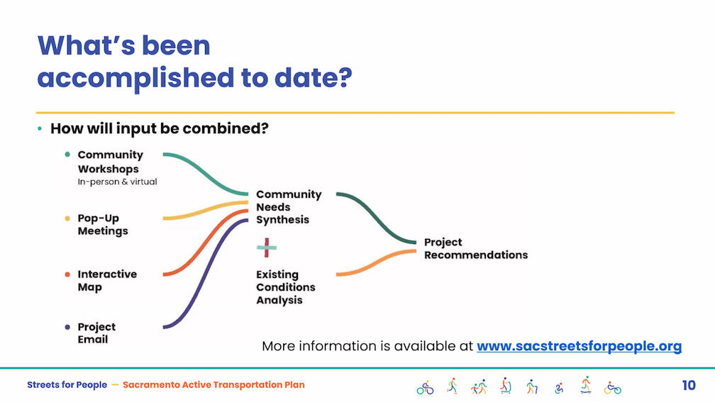 The City of Sacramento held the Streets for People Citywide Virtual Workshop #1 yesterday. Though the city may eventually post the slideshow, it is not on the program page Streets for People Active Transportation Plan yet, so I’m posting them here. These are low-ish resolution screen captures, so you won’t be able to see detail in them, but I hope they are still useful to you. I did not capture every single slide, but I hope the ones of interest are here. Of course the slides do not capture the presenter comments that went with each slide, which are important.