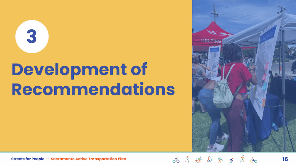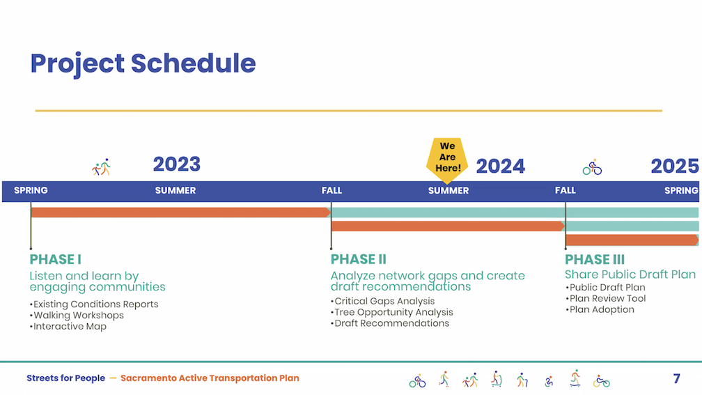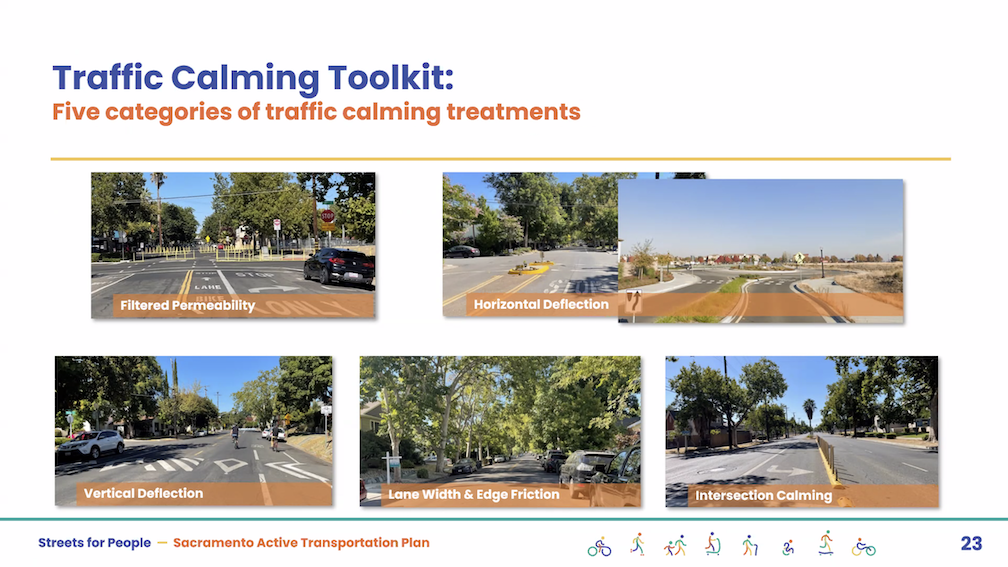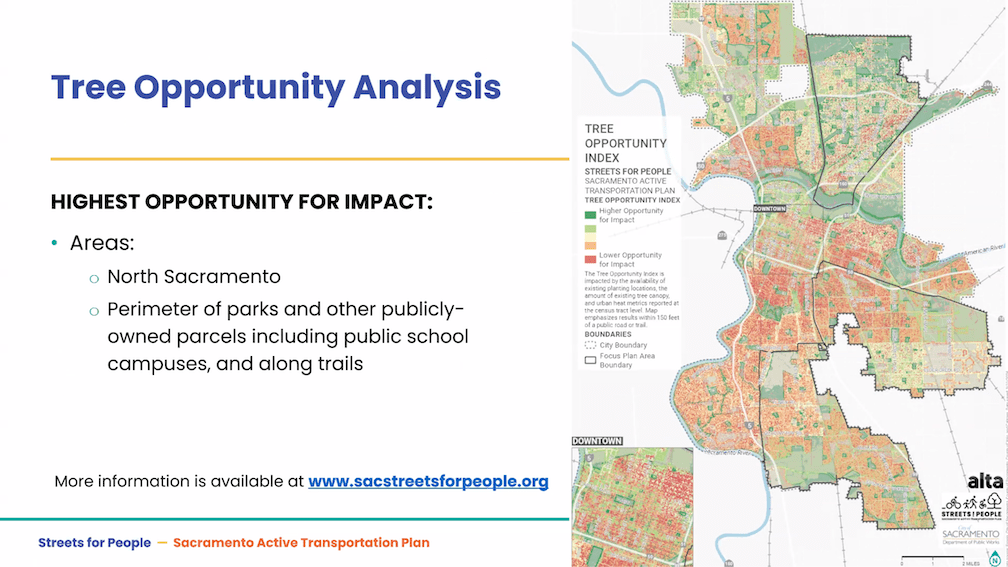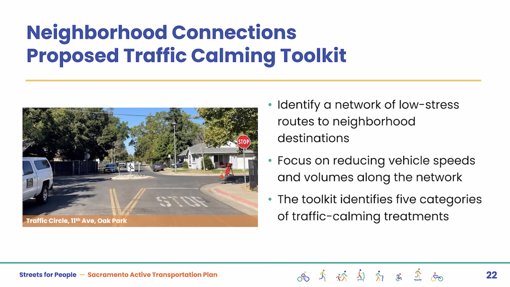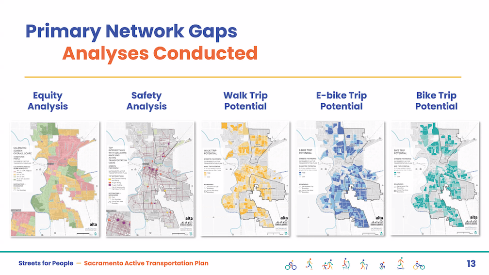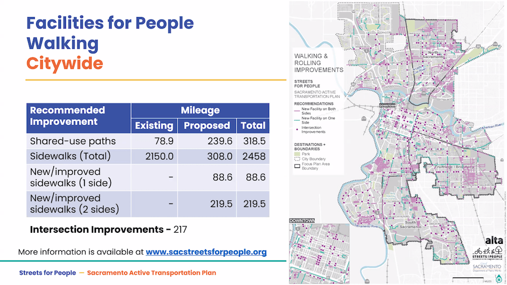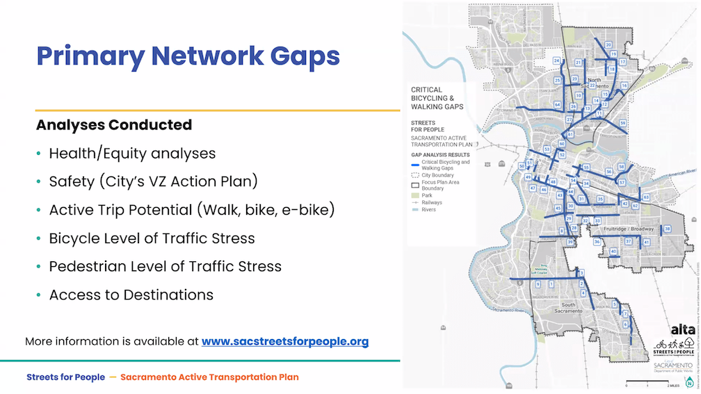 The City of Sacramento held the Streets for People Citywide Virtual Workshop #1 yesterday. Though the city may eventually post the slideshow, it is not on the program page Streets for People Active Transportation Plan yet, so I’m posting them here. These are low-ish resolution screen captures, so you won’t be able to see detail in them, but I hope they are still useful to you. I did not capture every single slide, but I hope the ones of interest are here. Of course the slides do not capture the presenter comments that went with each slide, which are important.