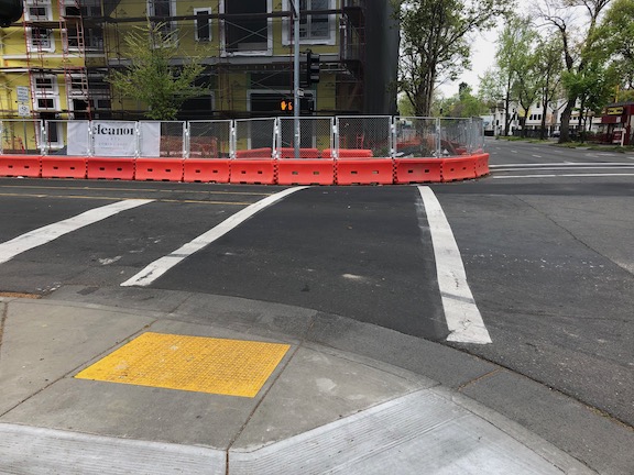 At J St & 11th St northwest corner, there should be a barrier and signing to indicate the crosswalk is closed, but neither is present.