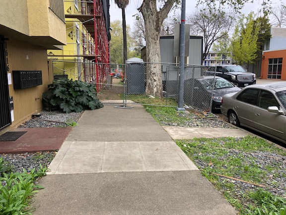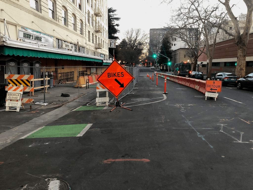 This construction zone failure is one among many in Sacramento. The city is not creating traffic control plans that accommodate walkers and bicyclists, and the construction companies are not appropriately placing signs and barriers. This is a violation of the ADA (Americans with Disabilities Act). Responsibility for encroachment permits (when the construction project goes into the public right of way, which includes sidewalks), and traffic control plans to mitigate the situation, rests with the City of Sacramento Department of Public Works.