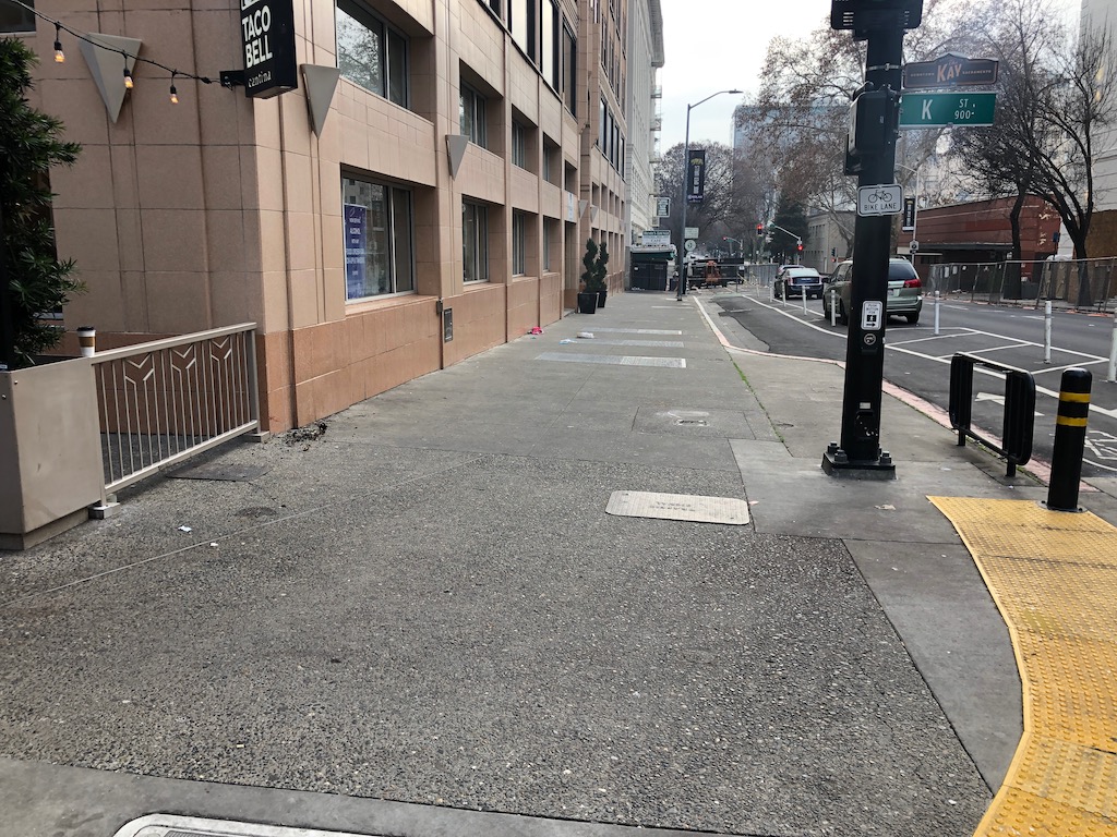 This blockage would in itself be bad, but it is made worse by the blockage of the sidewalk on the west side of 9th St, between K and the alley. This private project is also not properly signed and barricaded. Between these two projects, there is NO walker access on 9th St between K St and L St. None. None. None. Of course one could cross at the alley between one side and the other, but then the city conveniently has a walker-hostile code that crossing streets at alleys is illegal. Got the bases covered, Sacramento!