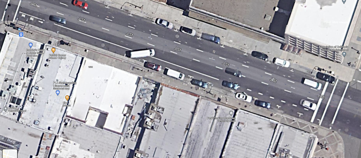 A channelized bypass should be created to carry the sidewalk for walkers and the bike lane for bicyclists past this construction site, between 10th St and 11th St, by removing a general purpose travel lane from J Street. The aerial below (before removal of the buildings) shows a sidewalk, a parking lane, a bicycle lane, three general purpose travel lanes, and a parking lane. The channelized bypass would include a shared pathway for walkers and bicyclists, in place of the right hand general purpose lane. The bypass can be created with use of orange construction barrier, as was done on 9th Street. This bypass would remain in place until construction is complete.