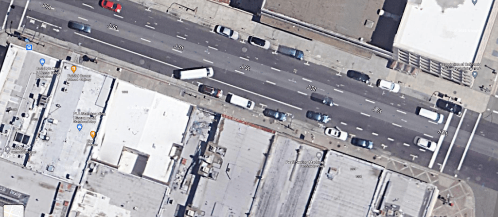 The intersection of 3rd Street and J Street is undergoing construction right now, most of it related to sewer line installation on 3rd Street, but perhaps related to other projects as well. Here is the Google image, not showing the current construction. I thought I had written about this intersection and its pedestrian hostility before, but I can’t find it searching, so it must have been one of those thoughts I never followed through on.